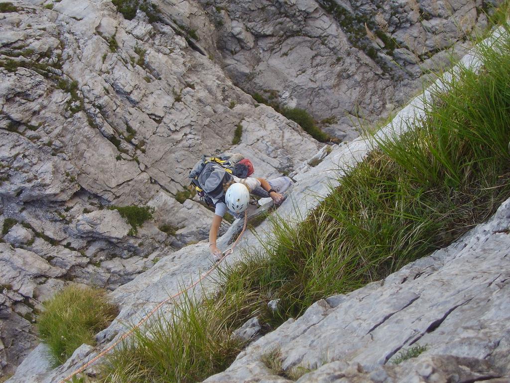 Salire la rampa sx fino al grande canale con roccia buona e erba (prestare attenzione a grossi blocchi instabili, a sinistra) percorrerlo in verticale fino alla base del sovrastante camino, attraversare alla comoda sosta in parete sulla destra.