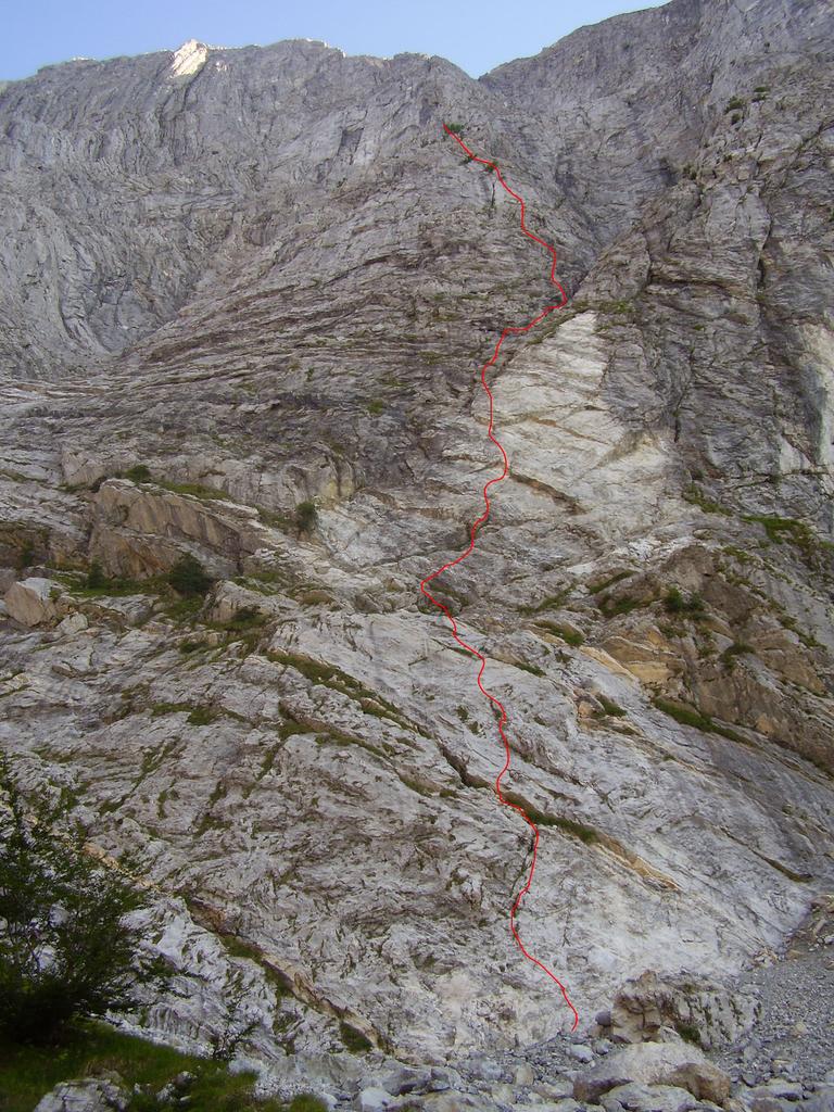 Salire sulla placca sovrastante e seguire la esile fessura ascendente dx fino alla sua fine, deviando in alto a sx per raggiungere la sosta sotto al tetto.
