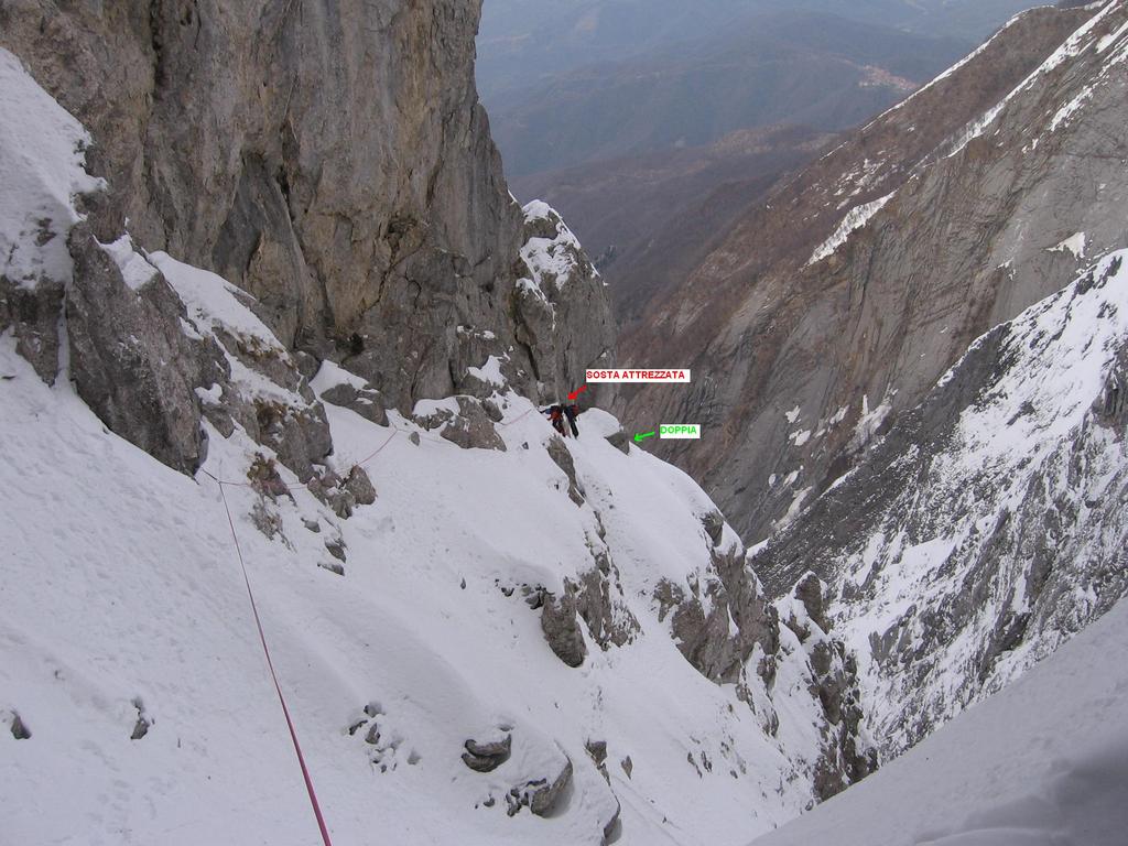 A questo punto si incontra un’altra piccola cengia con residuo di vecchia sosta, III;