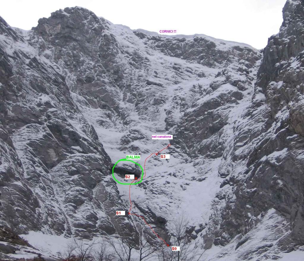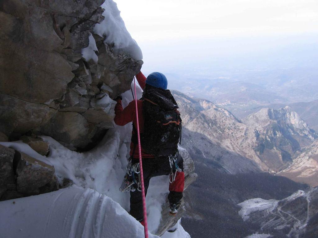 Placche e risalti fino ad uno spit piantato a mano, altri 30/40 metri, III; Si arriva alla cengia detritica con visuale sulla “Balma”, il grande arco di roccia naturale. Si punta a questo scegliendo un canale a destra (o a sinistra) per superare l’arco in maniera indiretta, IV/IV+, nessuna protezione