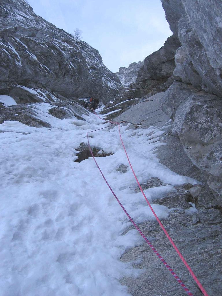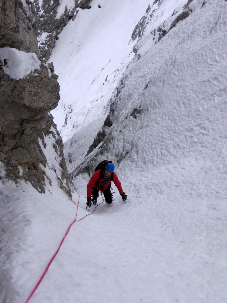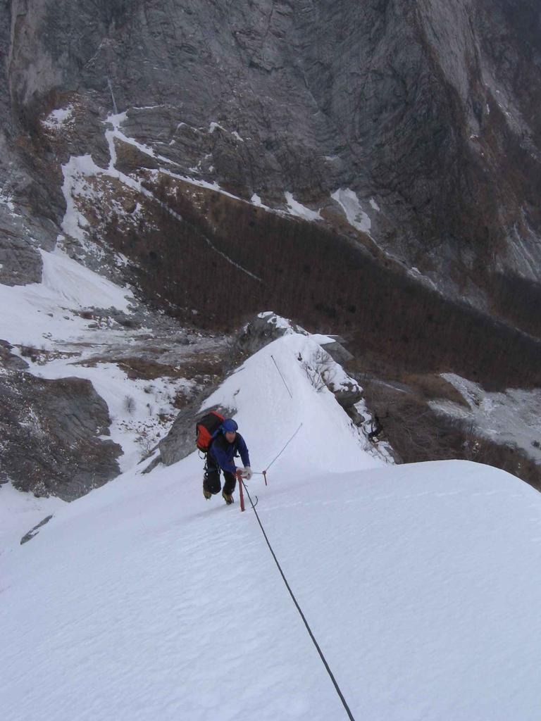 Sulla sinistra del nevaio per placche lisciate, almeno 60/70 metri di placca appoggiata ed obliqua nessuna protezione ne sosta III;