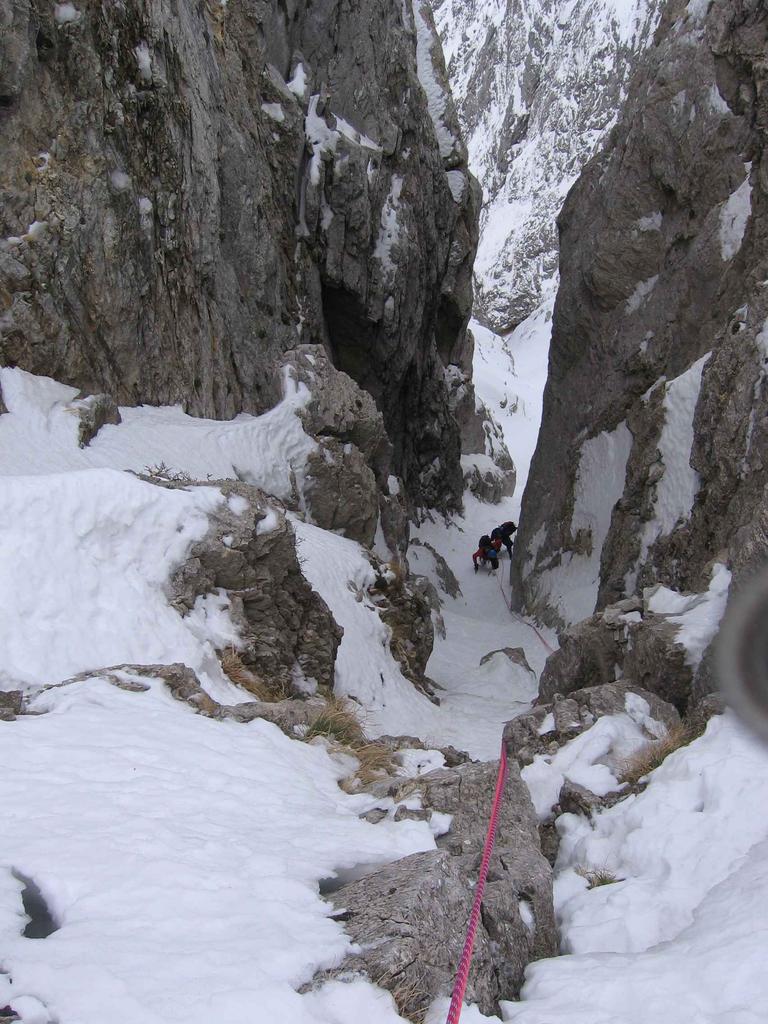Per placche e risalti fino a sosta con catenella, IV. Da qui possibilità si uscita per canale molto erboso a sinistra, che porta fuori dalla parete;