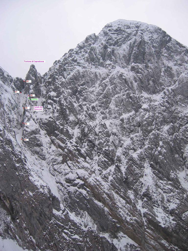 Oppure si può ancora uscire per la “Via del ripiano di Capradossa”, canale umido all’inizio ed erto e su roccia instabile, che si segue fino ad una netta strozzatura. Questo camino strozzato, con vecchia chiodatura, IV+, si supera sulla faccia destra con arrampicata classica, per giungere ad una piccola cengia alla base dell’ultimo tratto del canale. Da qui si apre la parete del torrione di Capradossa che ci si lascia sulla destra per seguire il canale che per piccoli diedri e camini pericolanti porta appunto alla cresta di Capradossa esposta a mezzogiorno. Per raggiungere la vetta del Pizzo occorre invece deviare a destra al meglio in obliquo, all’altezza della Balma, per prendere un altro lungo canale che, per circa trecento metri, attraverso camini e risalti, III, porta nel punto più alto della parete.