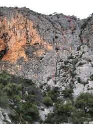 - L3 passo duro in partenza su fessurino, poi fessura atletica, diedro e uscita in traverso a destra su lame (ignorare la sosta visibile in alto a sinistra fra la vegetazione). Non fermarsi alla sosta di calata ma traversare facilmente alla sosta bis. 35 metr, 6b.