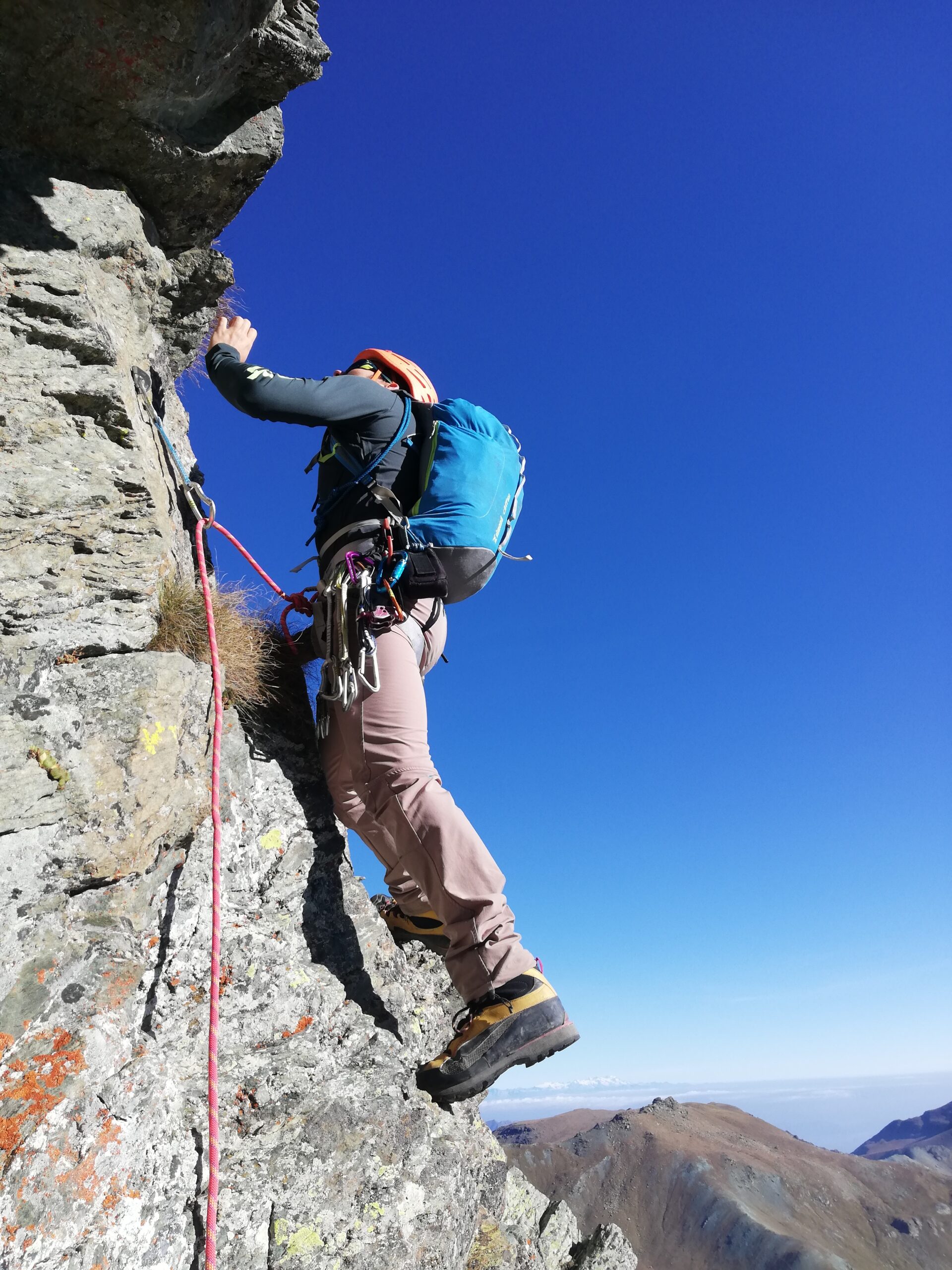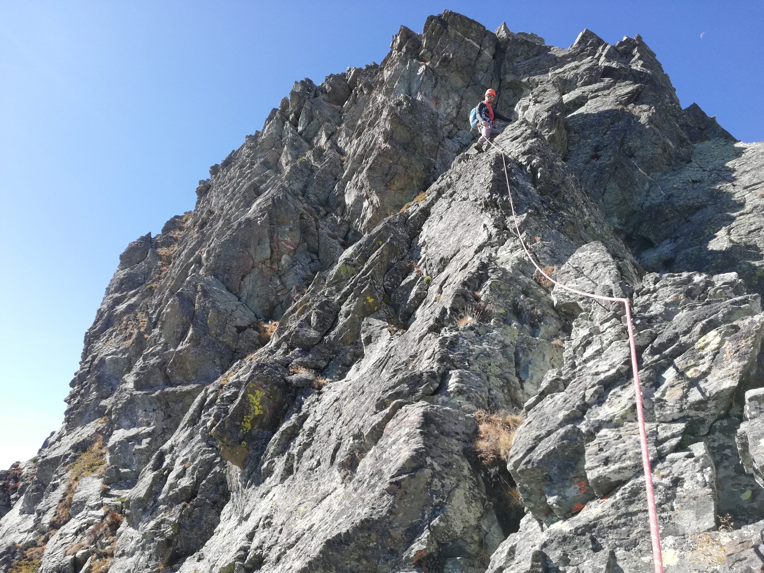 Avvicinamento veloce e panoramico. Attacco evidente, su L1 dopo il camino andare a dx e non puntare alla sosta sulla sx. L3 e L4 molto divertenti. Noi siamo saliti in conserva da L5 a L9, quindi abbiamo fatto ancora un tiro su L10 e poi abbiamo finito in conserva con gli ultimi due tiri. Attrezzatura da falesia, a volte fin troppo abbondante sul facile (ma d’altronde basta saltare qualche fix). Soste da collegare a 3 fix. Roccia generalmente sana e pulita dalle numerose ripetizioni, comunque qualcosina che ancora muove c’è (soprattutto sui tiri facili, occhio con persone dietro). Materiale utilizzato: 8 rinvii, corda da 50m. Discesa comoda e veloce fino al Giacoletti, poi due chiacchiere con gli stambecchi del rifugio e discesa dal sentiero “lungo”.