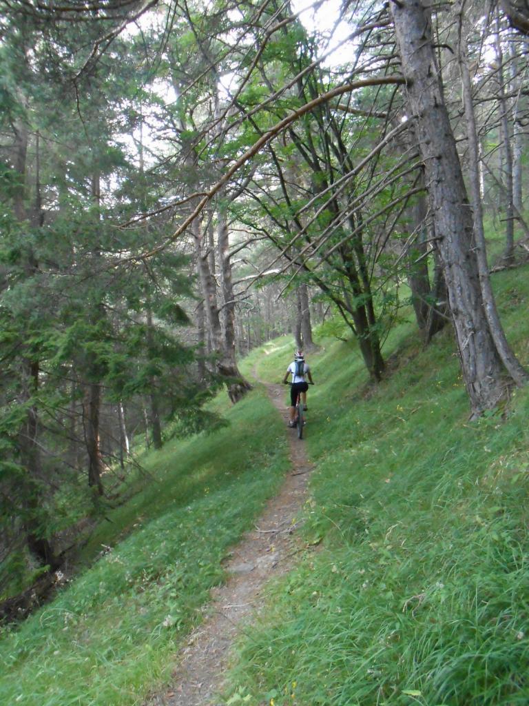B – un po’ più facile è la discesa Rochers de Servia (balise 310) – L’Escalette – Lac de la Pia. Con bel percorso sinuoso nel bosco si ricongiunge ad A sulla stradina verso Tenda.