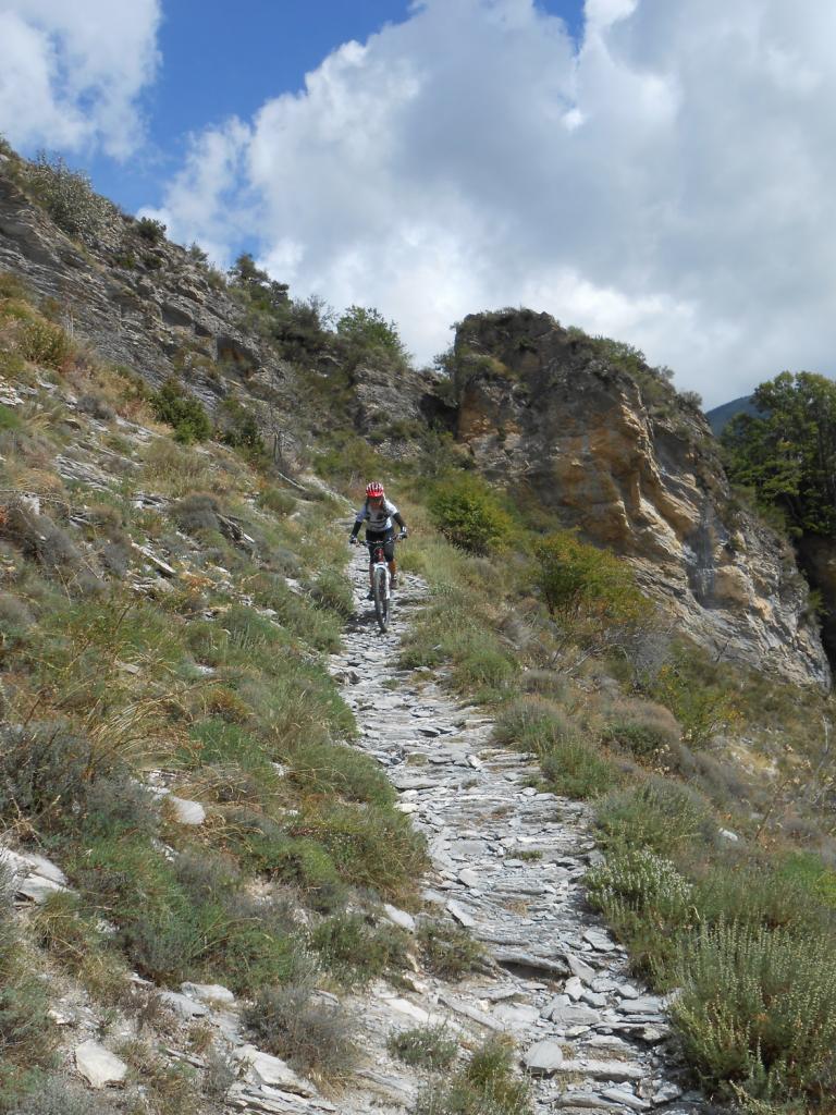 A – la più impegnativa: si segue la sterrata per risalire a Castel Tournou (portate una frontale per visitare la fortificazione scavata nella roccia!). Alla balise 317 si imbocca il sentiero verso le Granges de la Pia: molto tecnico, ripido, sconnesso, a tratti esposto ma di grande soddisfazione! Una vera perla. Dalle Granges a Tenda veloce stradina.
