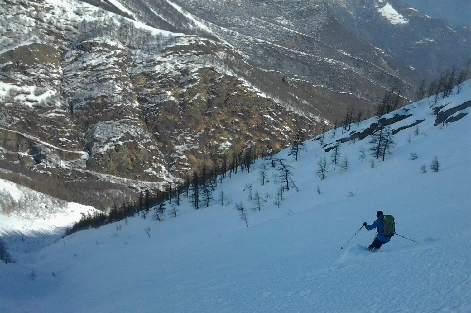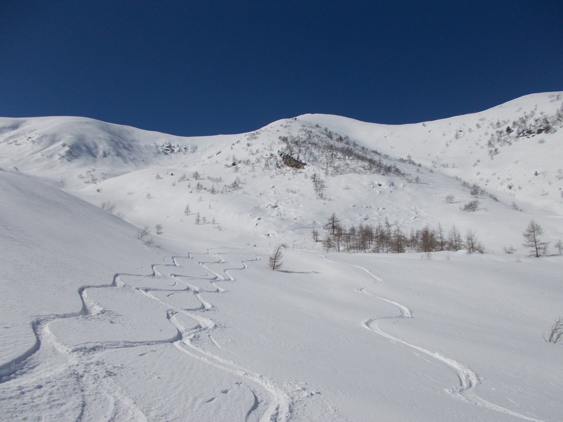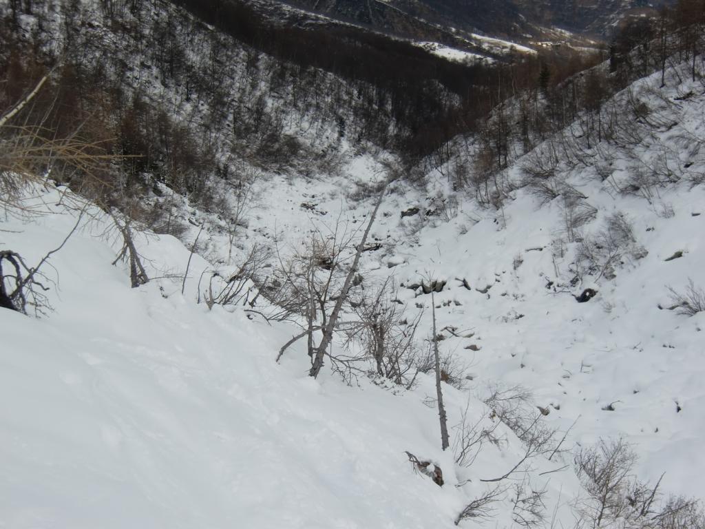 b) OS max 35° – lungo la paretina WNW che termina nel vallone della porta Sarasina. Prestare attenzione alle bastionate che ne abbracciano la base. Il passaggio più facile è anche il più evidente, dentro la gorgia visibile già dalla vetta. Dal vallone della Sarasina portarsi o sulla palazzina di Sertorio oppure scendere fino al greto del sangone (occhio, di nuovo biula party) e risalire per riportarsi nella stradina per pian neiretto all’altezza della valanga del 2010.