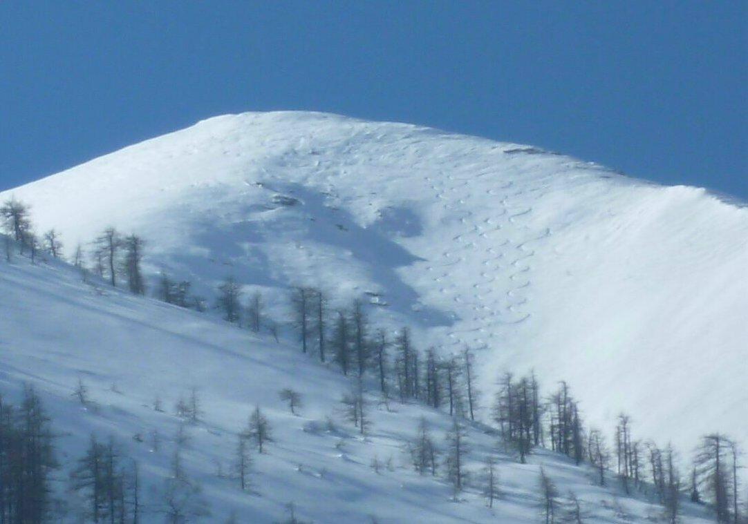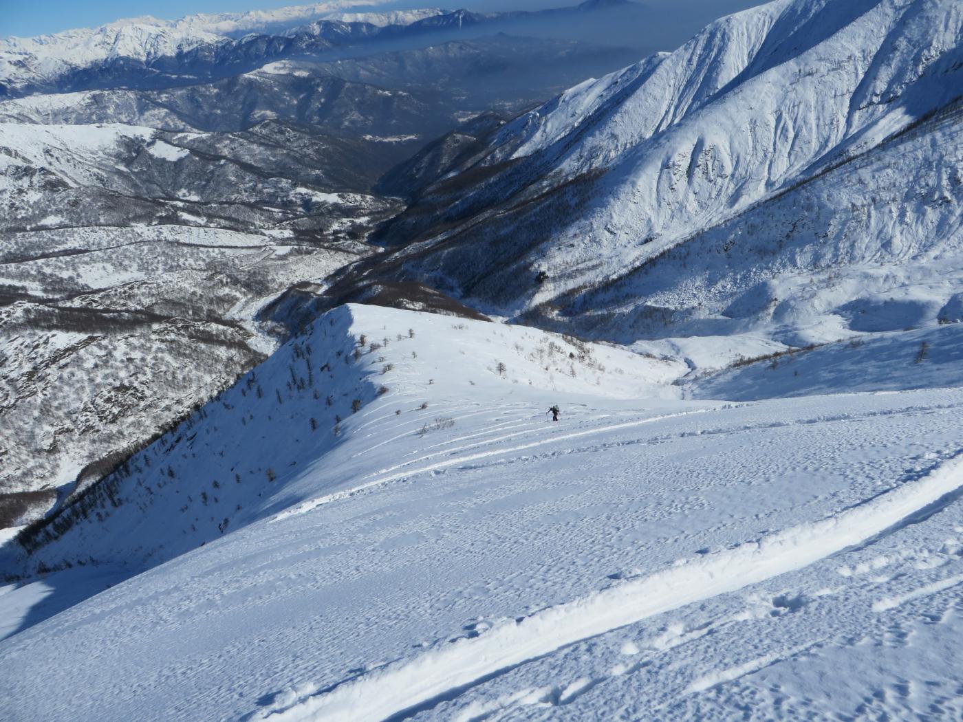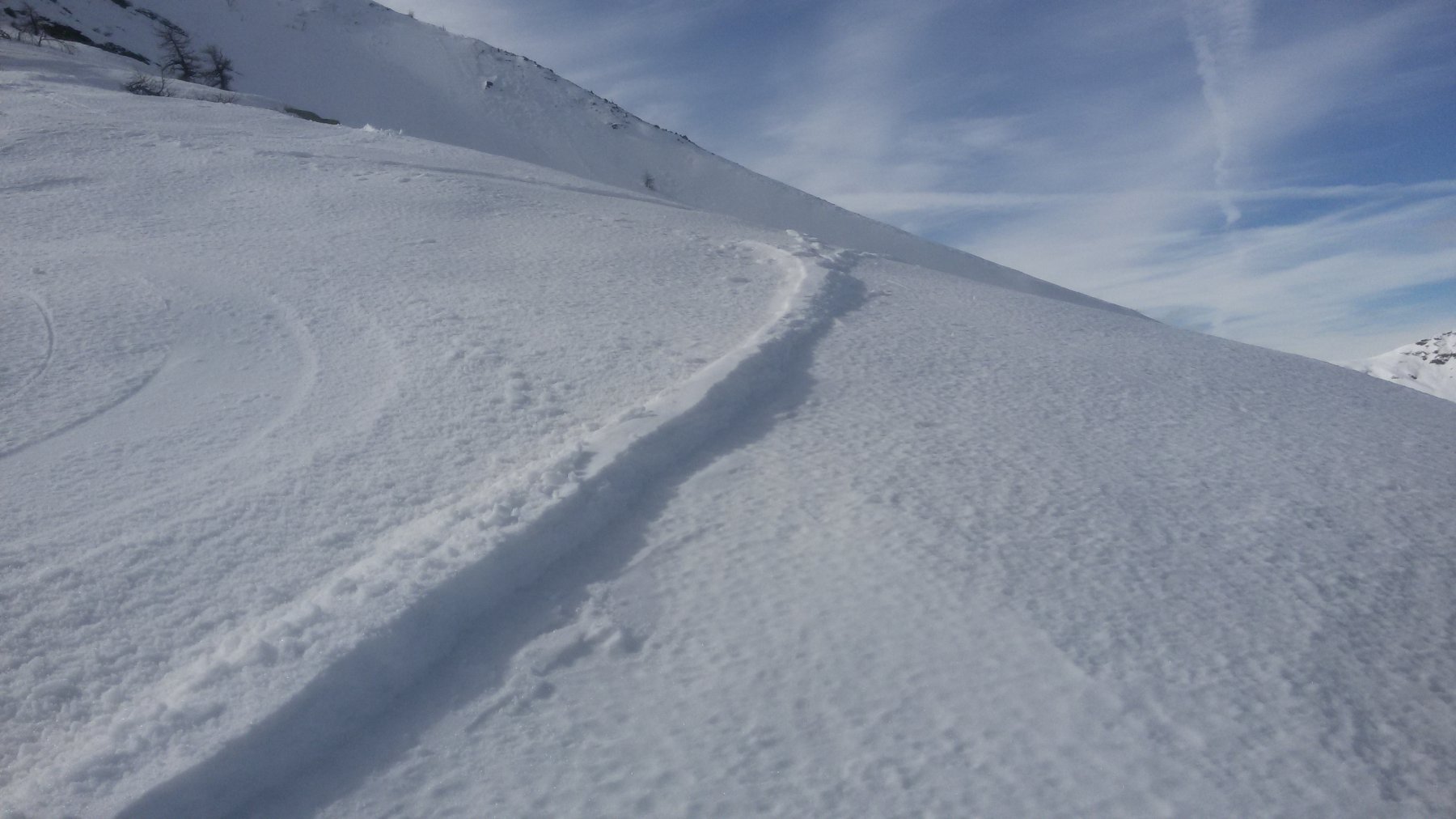 b) OS max 35° – lungo la paretina WNW che termina nel vallone della porta Sarasina. Prestare attenzione alle bastionate che ne abbracciano la base. Il passaggio più facile è anche il più evidente, dentro la gorgia visibile già dalla vetta. Dal vallone della Sarasina portarsi o sulla palazzina di Sertorio oppure scendere fino al greto del sangone (occhio, di nuovo biula party) e risalire per riportarsi nella stradina per pian neiretto all’altezza della valanga del 2010.