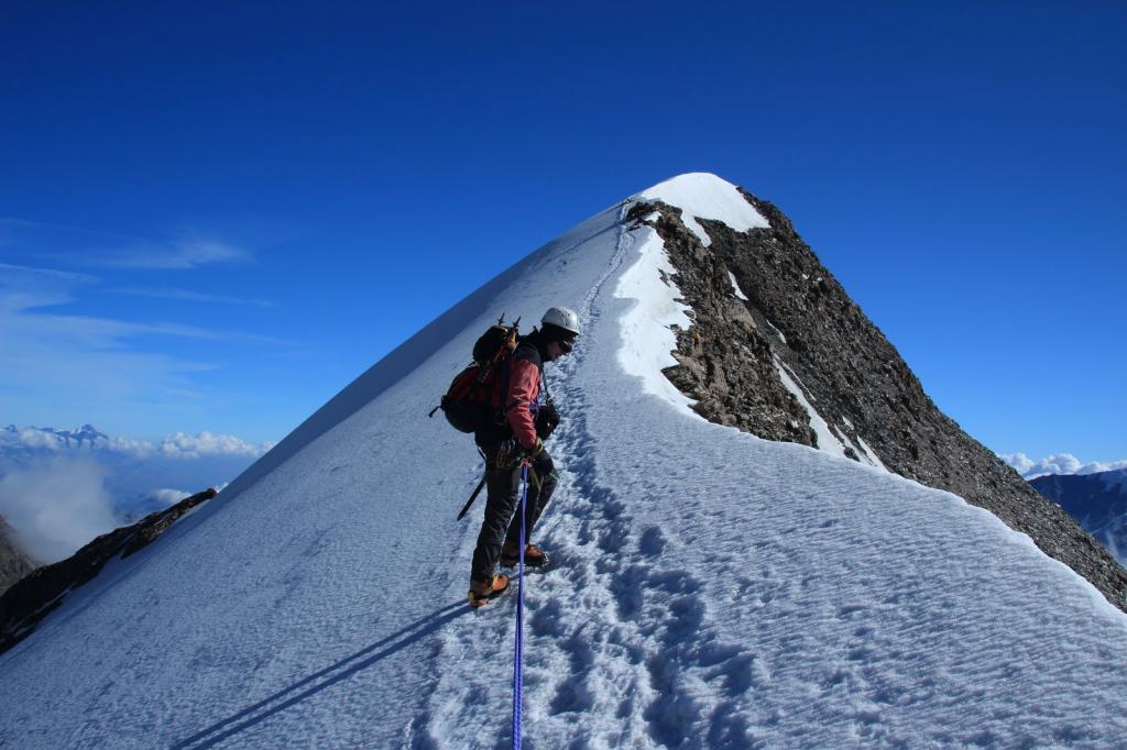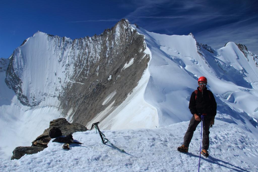 A dire il vero eravamo partiti con altre ambizioni e una meta diversa da questa, ma le condizioni precarie di un traverso in ghiaccio vivo e con neve inconsistente sopra tra Nadelhorn e Stecknadelhorn ci hanno indotto ad orientarci su questa cima, dato che io avevo già salito già per due volte in passato il vicinissimo Nadelhorn ! Siamo saliti sabato 10 alla Mischabel Hutte, utilizzando la cabinovia di Hannigalp e accorciando quindi di 1 ora l’avvicinamento. Saliti in 3 ore al rifugio, con percorso sempre ripido e abbastanza faticoso (anche per via del caldo), con il costone roccioso ben attrezzato e protetto da cavi metallici. Buona l’accoglienza ed il trattamento, anche la cena non è stata male, considerando che eravamo in Svizzera. Oltre a noi due erano presenti altri 6 italiani e il resto svizzeri e tedeschi per un totale di circa 50 persone. Al mattino di domenica 11, colazione alle 4,30 e partenza intorno alle 5,00 per fortuna con una giornata splendida e visibilità ottima (cielo limpido e stellato !). Il costone roccioso che porta al ghiacciaio è pulito e si sale bene, in circa 1 ora abbiamo raggiunto il ghiacciaio. Neve durissima e quasi sempre ghiacciata, con diversi crepacci ma tutti ben visibili. Si sale bene, seguendo una buona traccia, solo la rampa ripida che porta al colle del Windjoch è abbastanza insidiosa per la presenza di ghiaccio vivo (e richiede attenzione per la presenza di alcuni crepacci molto vicini alla pista..!!). Come detto prima, dopo aver rinunciato a salire lo Stecknadelhorn ci siamo riportati al colletto del Windjoch e siamo saliti in cima per la cresta SO sempre abbastanza affilata e per buoni tratti ghiacciata, ma che si saliva bene con un minimo di attenzione. Oggi su questa cima, pur secondaria rispetto alle sue vicine, eravamo presenti solamente noi due, tutti gli altri erano impegnati sul Nadelhorn. Visti anche 5 alpinisti salire la Nord della Lenspitze (e dato il periodo gli faccio i miei complimenti per la salita fatta !!). Il tempo si è mantenuto buono per nostra fortuna e il panorama osservato dalla cima era semplicemente spettacolare (dal Monte Rosa a tutte le cime dei Mischabel, fino ai colossi dell’Oberland Bernese con Monch, Eiger, Jungfrau e Finsteraarhorn). Insomma, pur essendo nata come gita alternativa (o di ripiego se preferite !) ci ha regalato soddisfazioni e gioie ! E come gradimento ho espresso ben volentieri le 5 stelle !