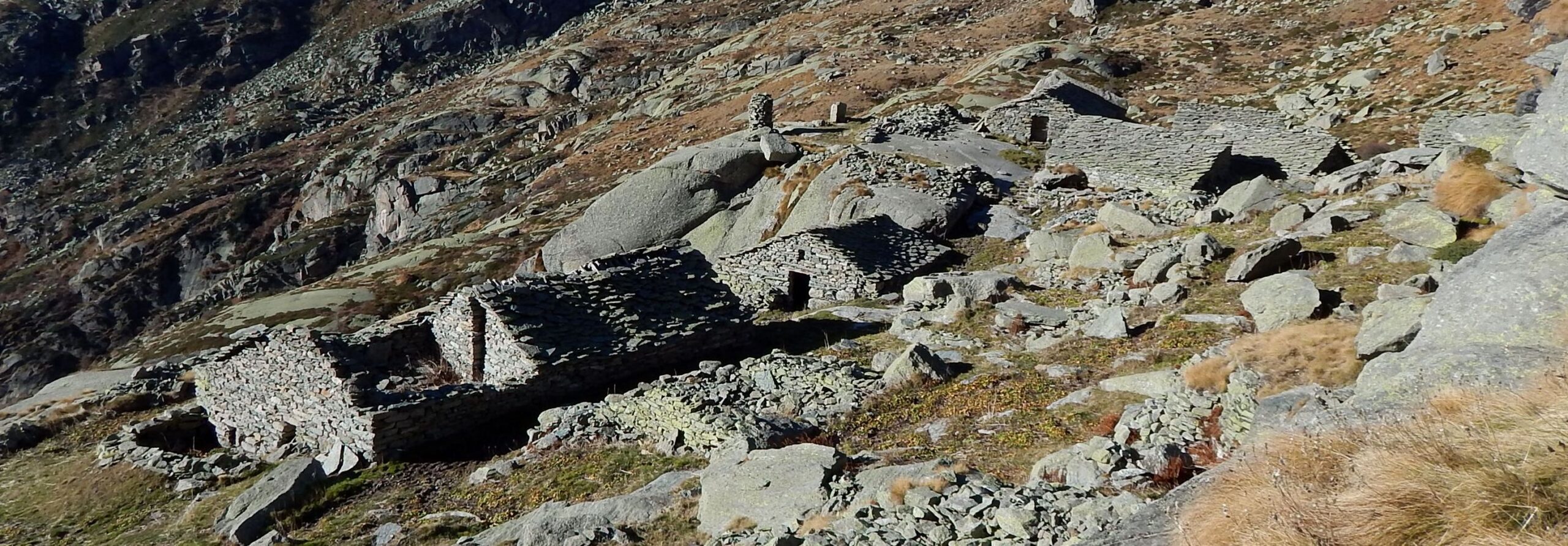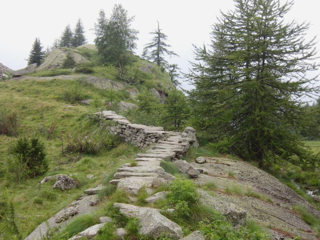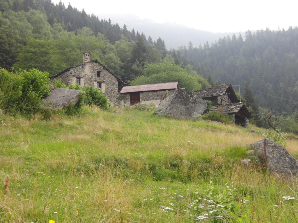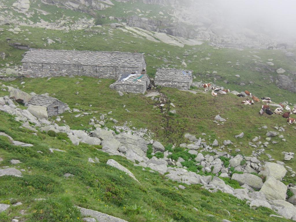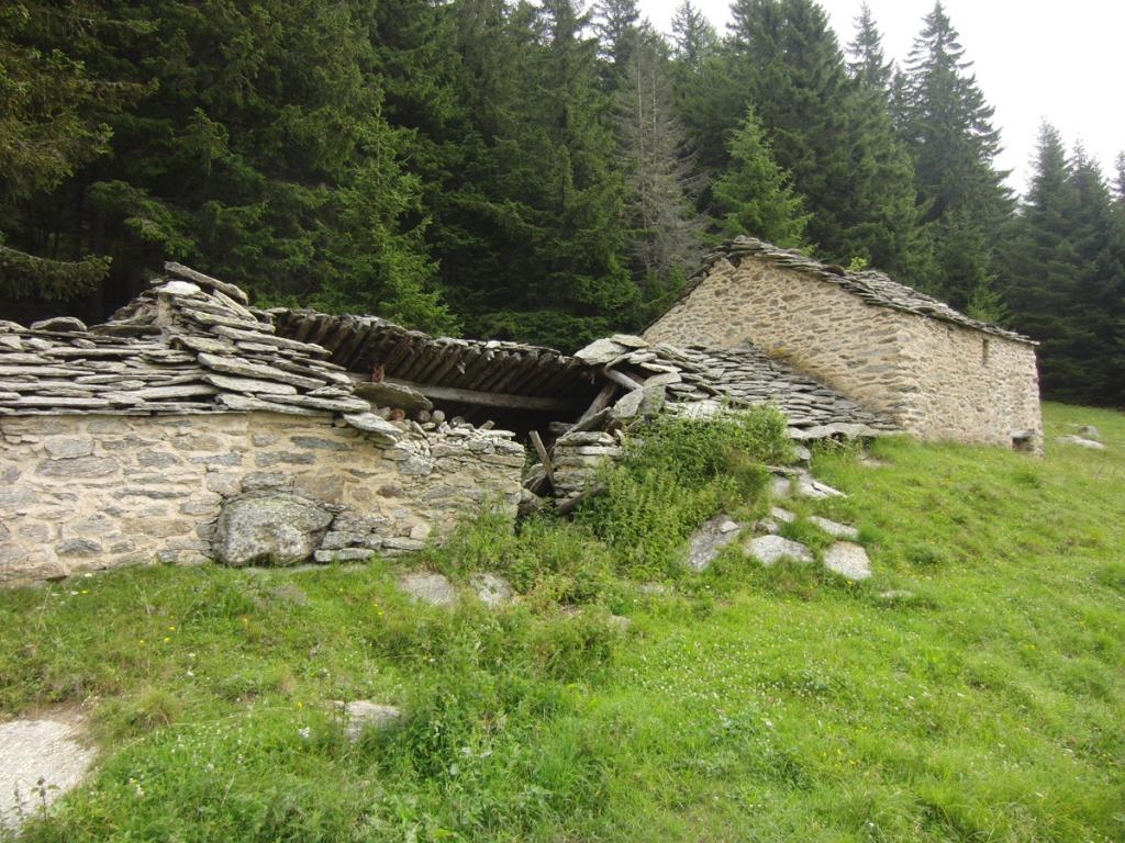 Proseguire nel ripiano dietro i fabbricati e puntare ad un lastrone di roccia ben visibile sulla destra, passarlo a destra (tracce di gradinata) ed attraversando sempre a destra su tracce, ometti e segni, tenendosi più alti del Gias Vecchio si giunge all’Alpe del Laietto dove passa il sentiero che sale dal vallone d’Unghiasse.