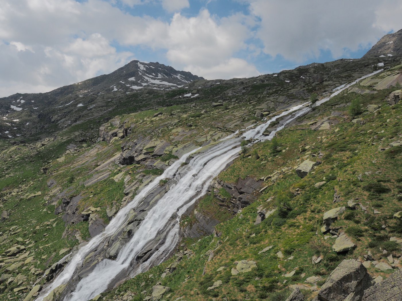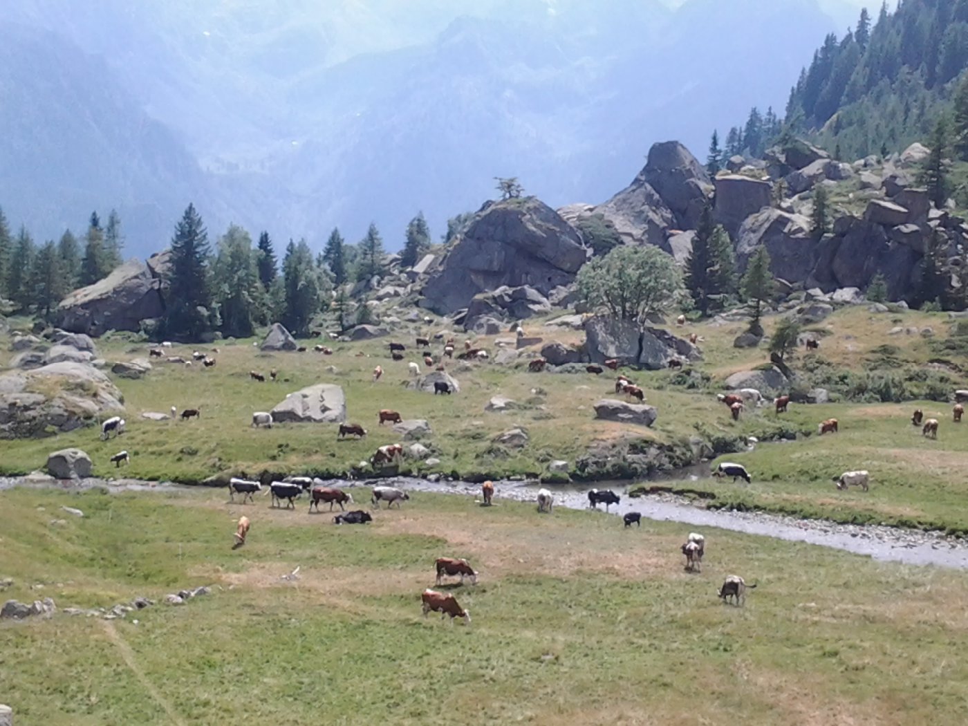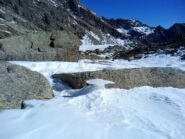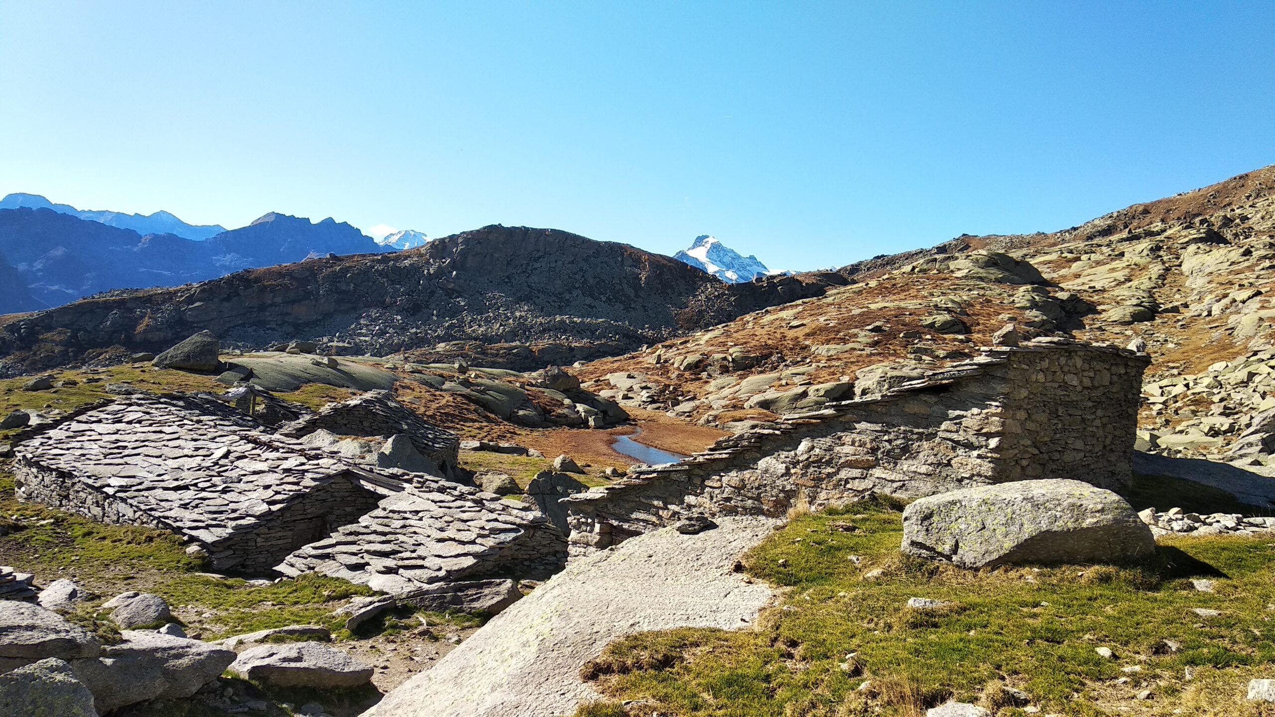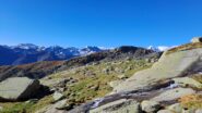 Proseguire nel ripiano dietro i fabbricati e puntare ad un lastrone di roccia ben visibile sulla destra, passarlo a destra (tracce di gradinata) ed attraversando sempre a destra su tracce, ometti e segni, tenendosi più alti del Gias Vecchio si giunge all’Alpe del Laietto dove passa il sentiero che sale dal vallone d’Unghiasse.