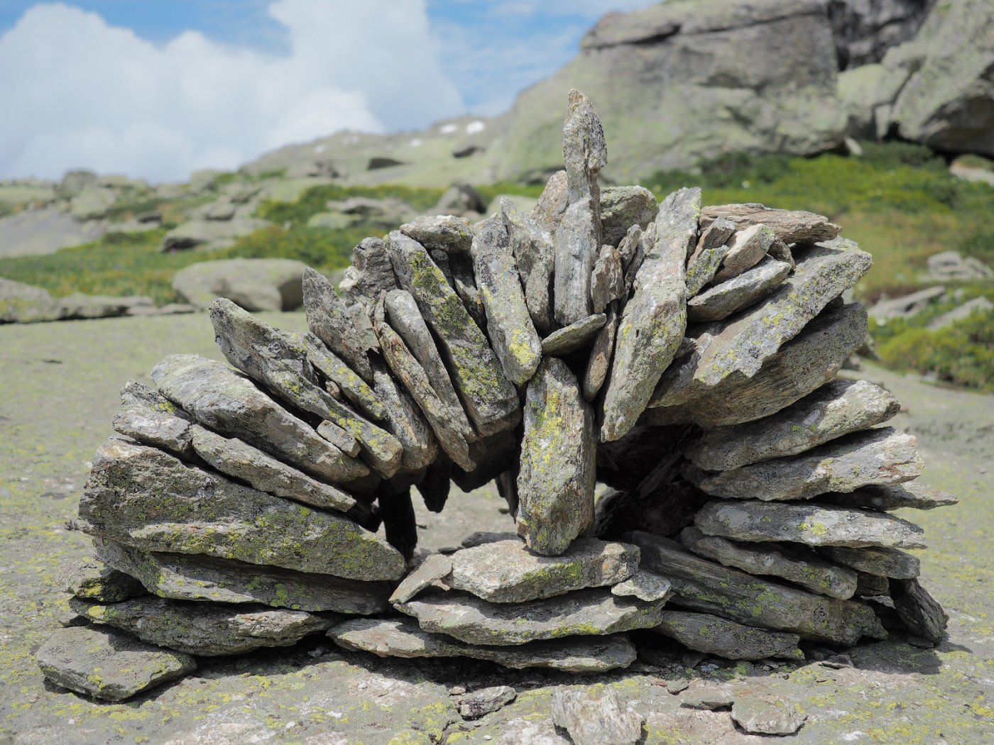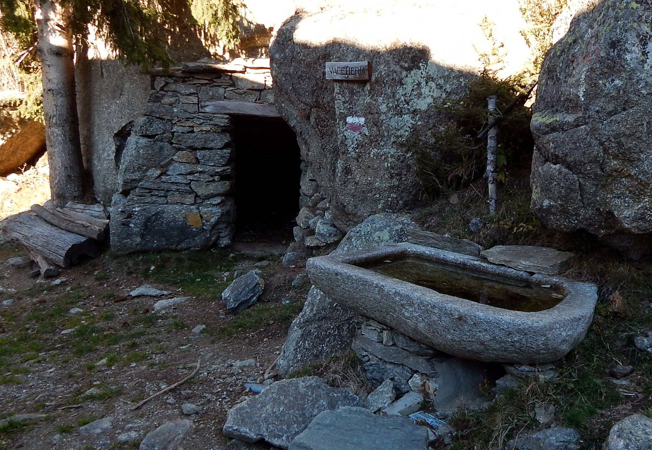 Effettuare un traverso ascendente verso destra puntando ad un grosso ometto ben visibile sulla cresta della Roccia Cialva, seguendo accenni di traccia, ometti ed una recente e bella segnatura con bollini e frecce rosse, fino a valicare il dosso. Sul versante opposto attraversare in leggera discesa (seguire sempre gli ometti e le frecce rosse) passare una breve pietraia e raggiungere il Gias del Sole caratteristico per una stalla con volta in pietra (sono ben visibili i grossi fermi dei tiranti sulla parete esterna).