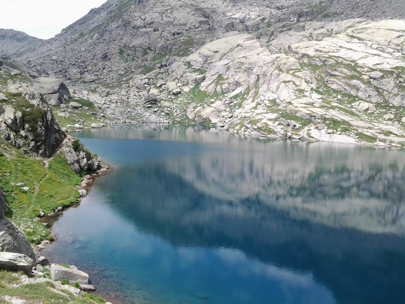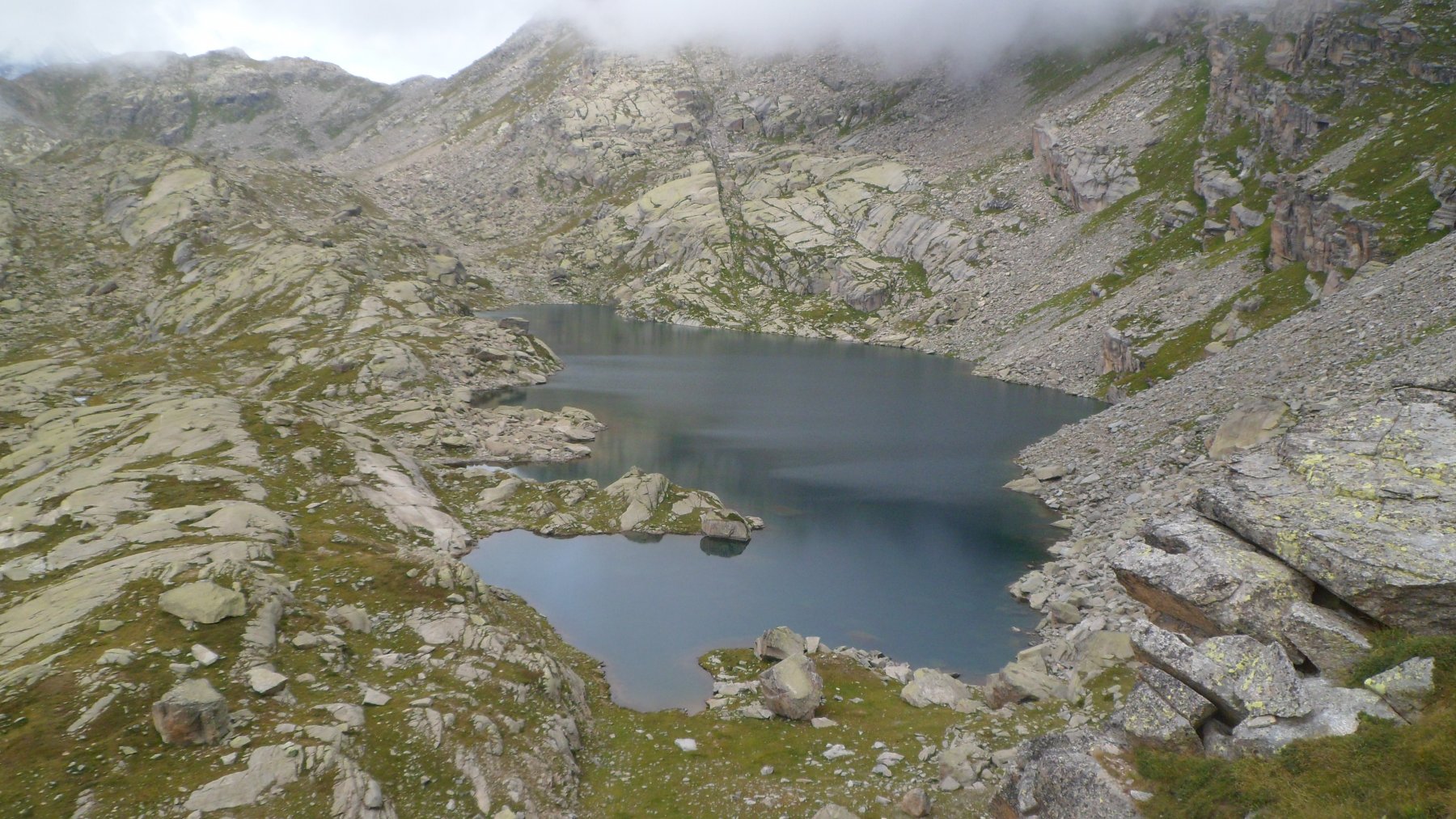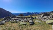 Proseguire attraversando sempre verso destra fino ad incontrare una palina di un bivio (deviando a sx e valicando vari dossi montonati nei pressi di un corso d’acqua si va per l’alpe Becco degli Uccelli ed il Lago Fertà mentre proseguendo diritto si passa al di sopra dell’Alpe Mese d’Agosto e si giunge direttamente al Gran Lago). I laghi Fertà, Gran Lago ed il Lago d’Unghiasse sono tutti collegati con un sentiero (tracce, segni ed ometti) che transita sulle loro sponde sud. Dai ruderi posti sulla sponda sud del Lago d’Unghiasse dove è presente il sentiero che sale al Colle della Terra d’Unghiasse inizia la discesa su facile terreno lungo flebili tracce (ometti) stando sempre a sinistra delle rocce montonate e del corso d’acqua fino a raggiungere il sentiero del vallone d’Unghiasse nei pressi dell’Alpe Miandetta e lungo questo si scende ad Alboni ed al punto di partenza.