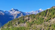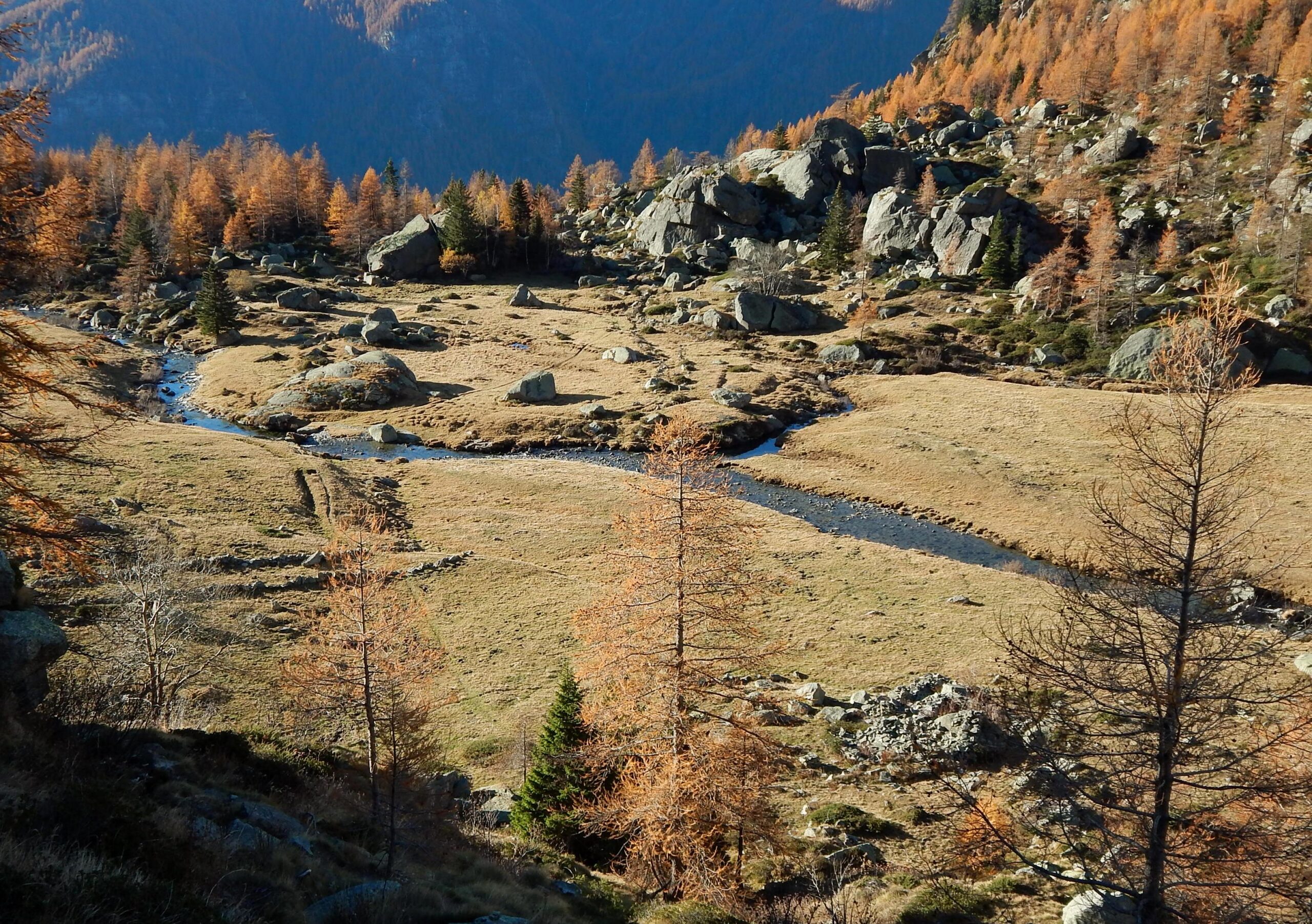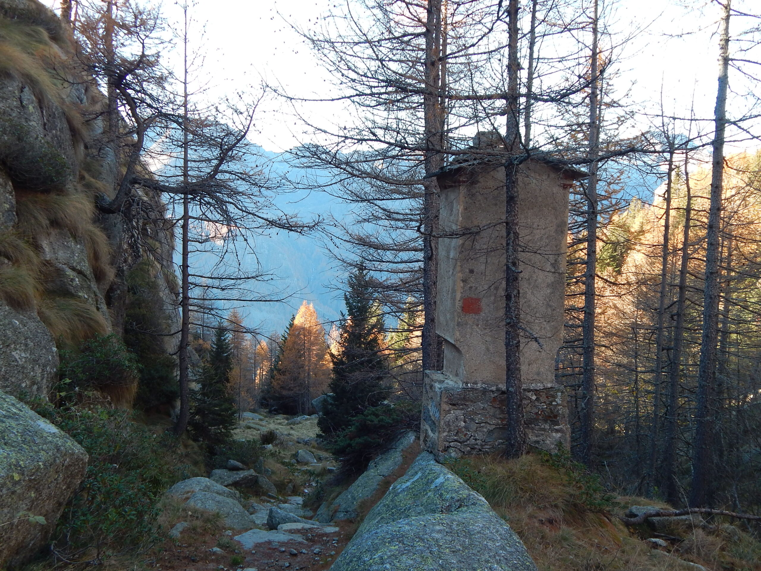 Salire nel lariceto al di sopra tenendosi gradualmente a sinistra su accenni di traccia (ometti) restando sulla sponda sx or. del corso d’acqua che marca il compluvio fino ad uscire dal bosco per portarsi su un accenno di dorsale ben visibile sulla sinistra.