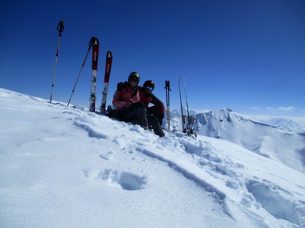ridiscesi alla Fuorcla Giavagl abbiamo preso la Val Peja… primo tratto con abbondante farina…poi lungo e scomodo traverso, per raggiungere le baite, con tracce dure di passaggio alternate da neve molliccia, e da queste ripreso il largo sentiero fino ad recuperare la traccia di salita per dorsale all’Arpiglia..
