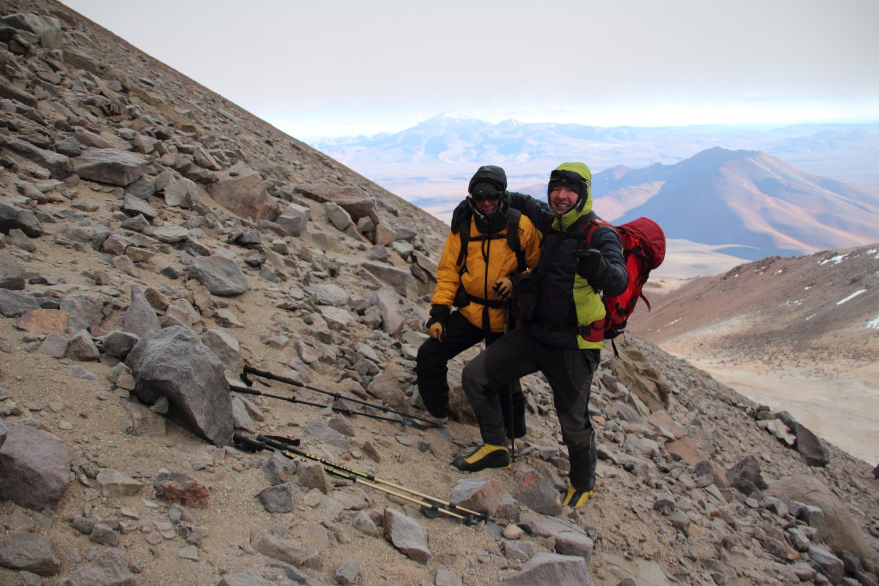 Dopo la sgambata iniziale a Chacaltaya e il tour Salar de Uyuni – Laguna Colorada – Laguna Verde è arrivato il momento di dedicarci alla salita del primo 6000 in programma del nostro viaggio in Bolivia. Siamo partiti alle 4,30 dall’Hostal Kantuta di Quetena Chico con il fuoristrada, guidato da Miguel e in compagnia di Marcelo, la nostra guida locale. Arrivati a quota 5400 m lungo la stradina mineraria, oltre la stradina era piuttosto sconnessa, con pietroni sulla strada e di fatto impraticabile. Ma per il nostro acclimatamento io avevo già il proposito di fermarmi a quota 5300 o 5400 m al massimo, perchè volevo dare un senso a questa salita e prevedere almeno un dislivello di 600/700 metri. In quanto io sono contrario a salire troppo in alto con i mezzi meccanici o comuque impianti di risalita. A me piace salire dal basso e a piedi, e “conquistarmi” la cima con le mie gambe, con le mie forze….e se non sono in giornata oppure non sono in forma piuttosto preferisco rinunciare alla cima e tornare indietro. Siamo partiti con meteo variabile, parzialmente nuvoloso, con vento abbastanza forte e un freddo intenso e pungente! Dopo quasi 100 metri di dislivello Marcelo (la nostra guida) ferma Enrico (lo sente tossire e lui valuta che non sia in grado di proseguire oltre) e lo rimanda al parcheggio dove si trova il nostro fuoristrada. Proseguiamo quindi in tre, io, Davide e Marcelo. Fino al colle di quota 5700 m, a parte il vento forte e il freddo, si riesce a salire abbastanza bene. Iniziamo la salita del ripido versante NO della cima principale dell’Uturuncu, e fino a 5850 m saliamo con passo regolare, anche se sferzati dal vento. Qui, Davide scopre di aver un principio di congelamento al naso e un freddo intenso alle dita dei piedi, e quindi inizia a perdere sensibilità nella camminata. Secondo stop e altra rinuncia, a questo punto Marcelo decide di accompagnare Davide in discesa. Io mi sento in forma, e nonostante il vento e il meteo variabile sono molto motivato e carico, non me la sento di iniziare con una rinuncia. Tra l’altro per me questa cima ha un significato particolare, potrebbe essere il mio decimo 6000 e quindi ci tengo molto a fare…la cifra tonda! Trovato un accordo con Marcelo, che si è subito reso conto di non aver di fronte un pivello alle prime esperienze in quota…mi ha lasciato andare augurandomi buon divertimento! Ho risalito la parte finale del pendio detritico e raggiunto il colletto. Da qui finalmente un’ampia schiarita e si vedeva la cima! Entusiasmo e motivazioni che sono salite ancora di più….ho superato il ghiacciaio di conca, qualche metro in cresta e poi finalmente la cima! Cumbreee! Per la decima volta nella mia vita mi ritrovo in vetta ad un 6000!!! Grande soddisfazione e gioia per un semplice alpinista della domenica come me! Fa un freddo intenso in cima (ben -22°!!) per cui in cima resto circa 20 minuti….ma ho il tempo necessario per ammirare il panorama, fare qualche foto e godermi il momento che pregustavo da tempo! Obiettivo raggiunto! Mi spiace solo non aver condiviso la gioia della cima con i miei amici e con la guida….ma oggi mi sentivo che sarei arrivato in cima, e anche il meteo è migliorato, premiando la mia costanza. In discesa, con un minimo di attenzione sul ghiacciaio, poi il pendio detritico non mi riserva nessun problema, al colletto incontro Marcelo che mi aspettava, e insieme ritorniamo al parcheggio di quota 5400 m.