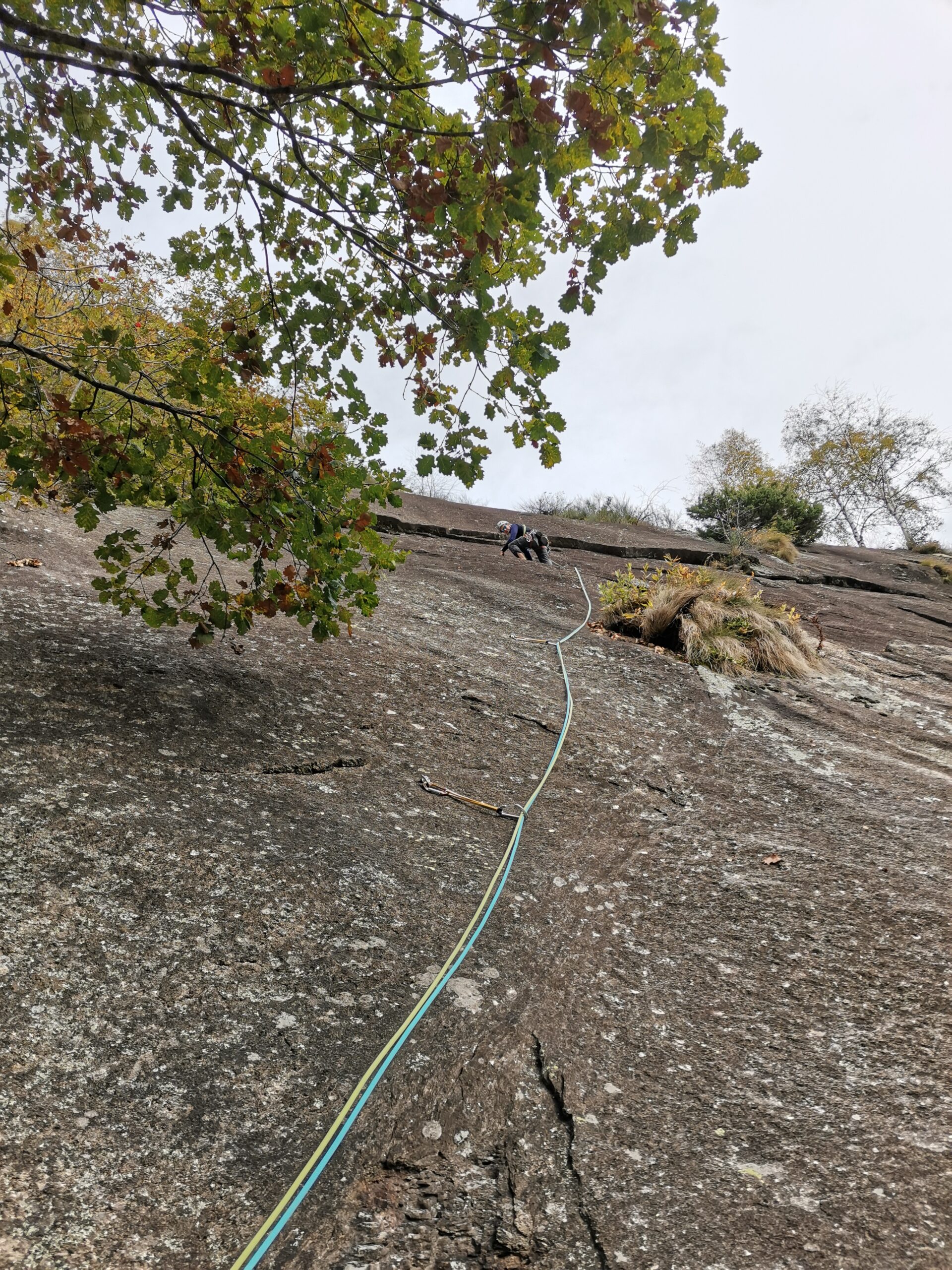 Soste tutte comode e attrezzate per calata, ma i due tratti di collegamento tra arbusti e alberelli non ne invogliano l'uso, se non per una ritirata improvvisa (vedere foto per la posizione calate fuori via).
