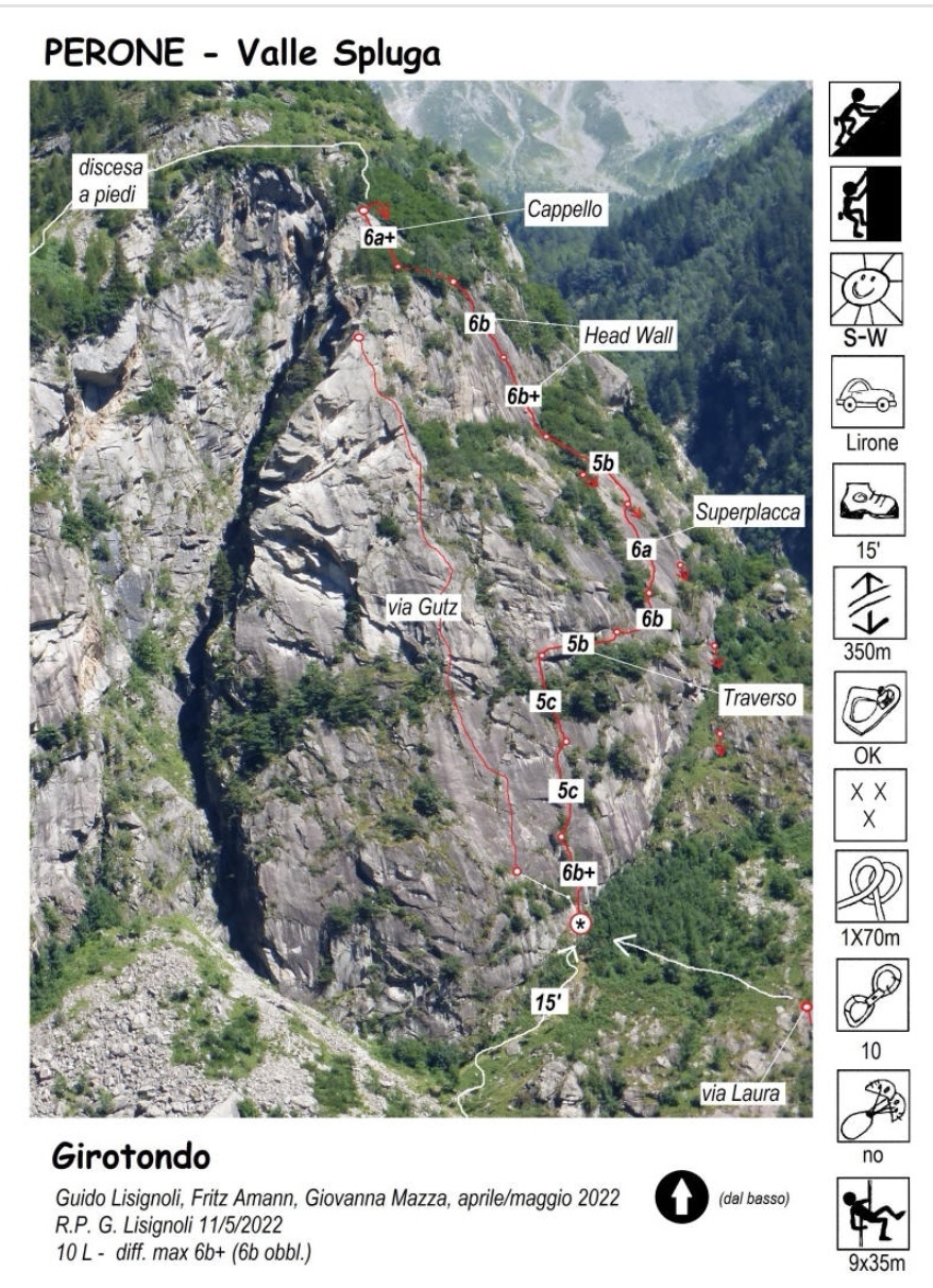 Scendere la strada a piedi poche decine di metri, prendere la mulattiera a sx passando davanti al ristoro "Ca' nei sass"; passare sotto un enorme sasso con tavolini e poco dopo abbandonarlo seguendo la traccia in piano verso destra (bolli rossi). Arrivati all'argine in pietra: salirlo e seguirlo in salita superando due gradoni, al terzo uscirne a destra su traccia. Poco dopo si trova il cartello indicatore ("Perone" a destra), e seguire gli ometti risalendo la pietraia prima il pendio erboso poi, fino ad arrivare alla base della struttura. Corda fissa blu indica l'accesso alla cengia per l'attacco della via "Gutz", mentre "Girotondo" resta indipendente seguendo i fix nuovi dritti sopra la verticale della corda fissa. (15 minuti)