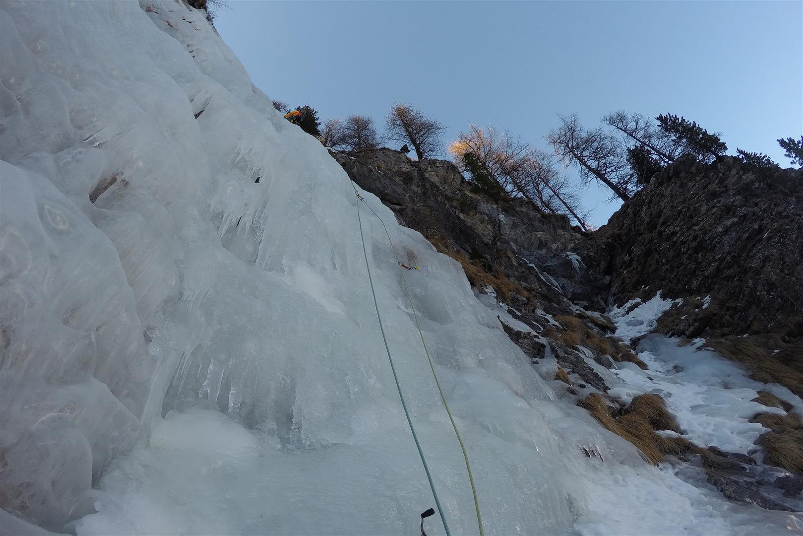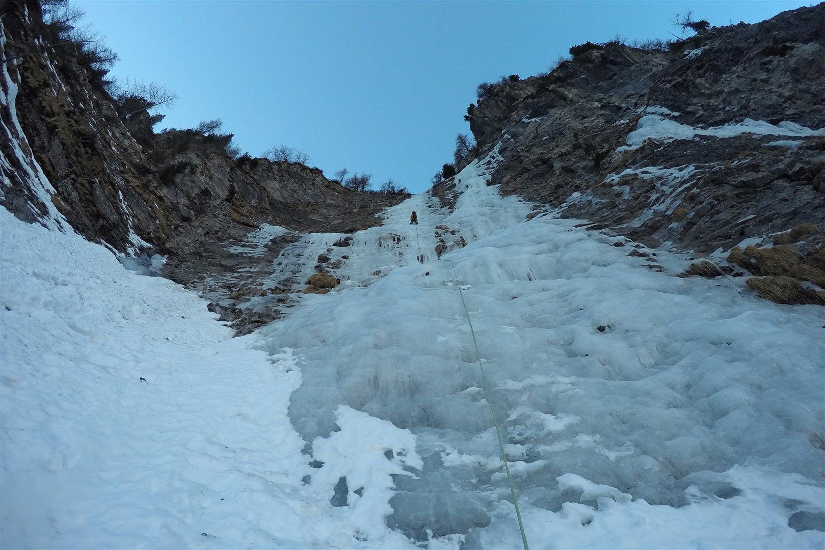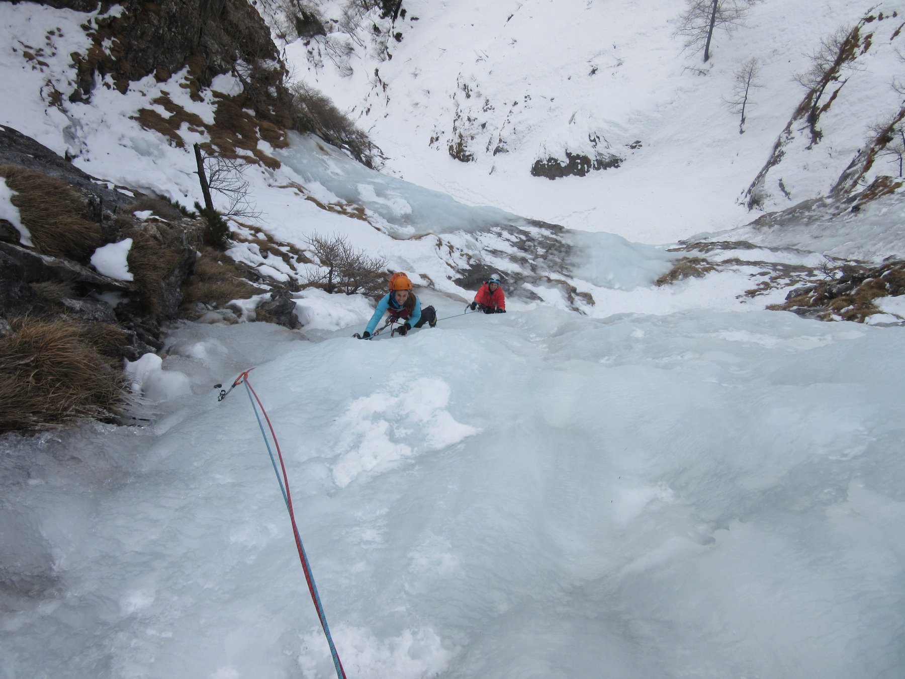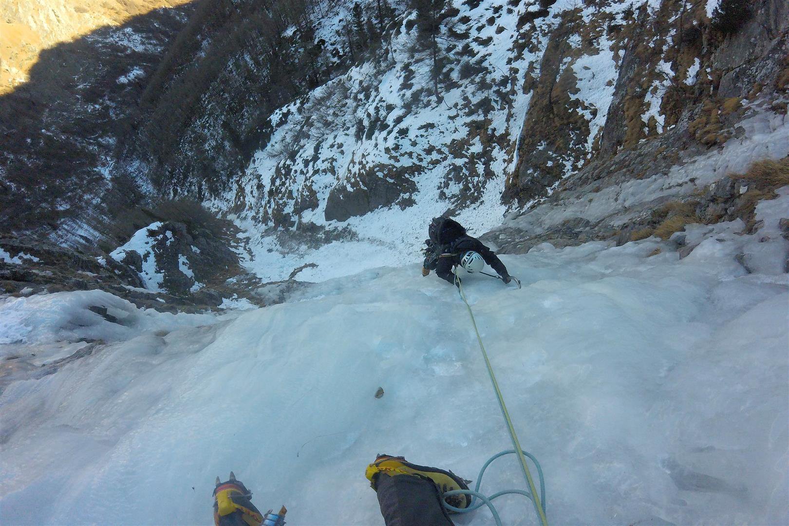 Si effettua in 3 tiri, attenzione a fare sosta alla base dell’ultimo risaltino perchè la sosta a cima cascata (cordino incastrato a dx, da integrare con friend 0.3) è a 58 metri.