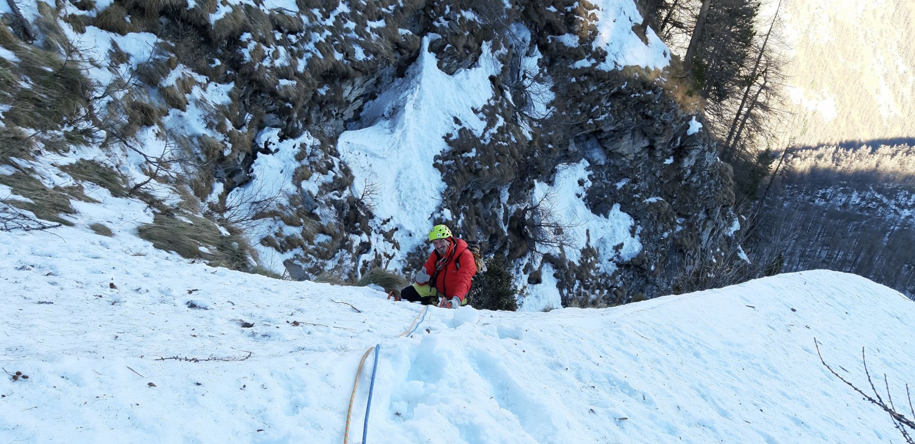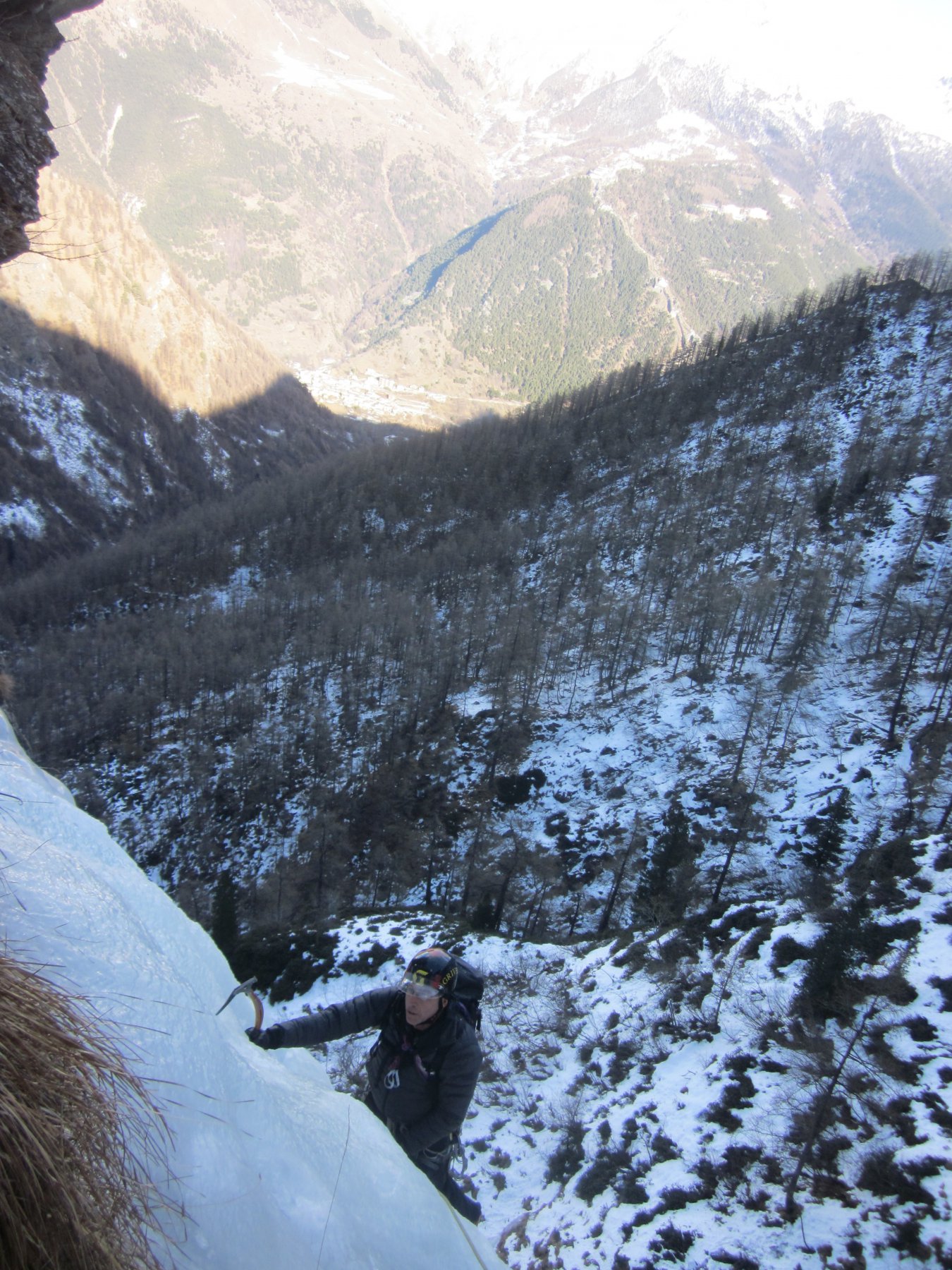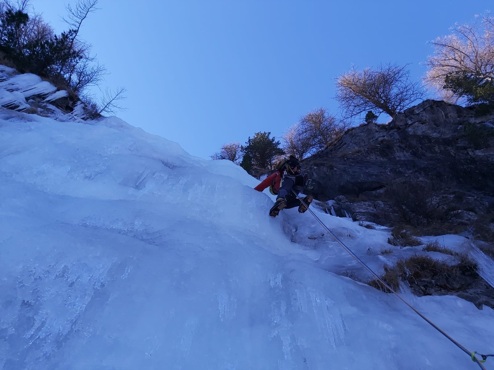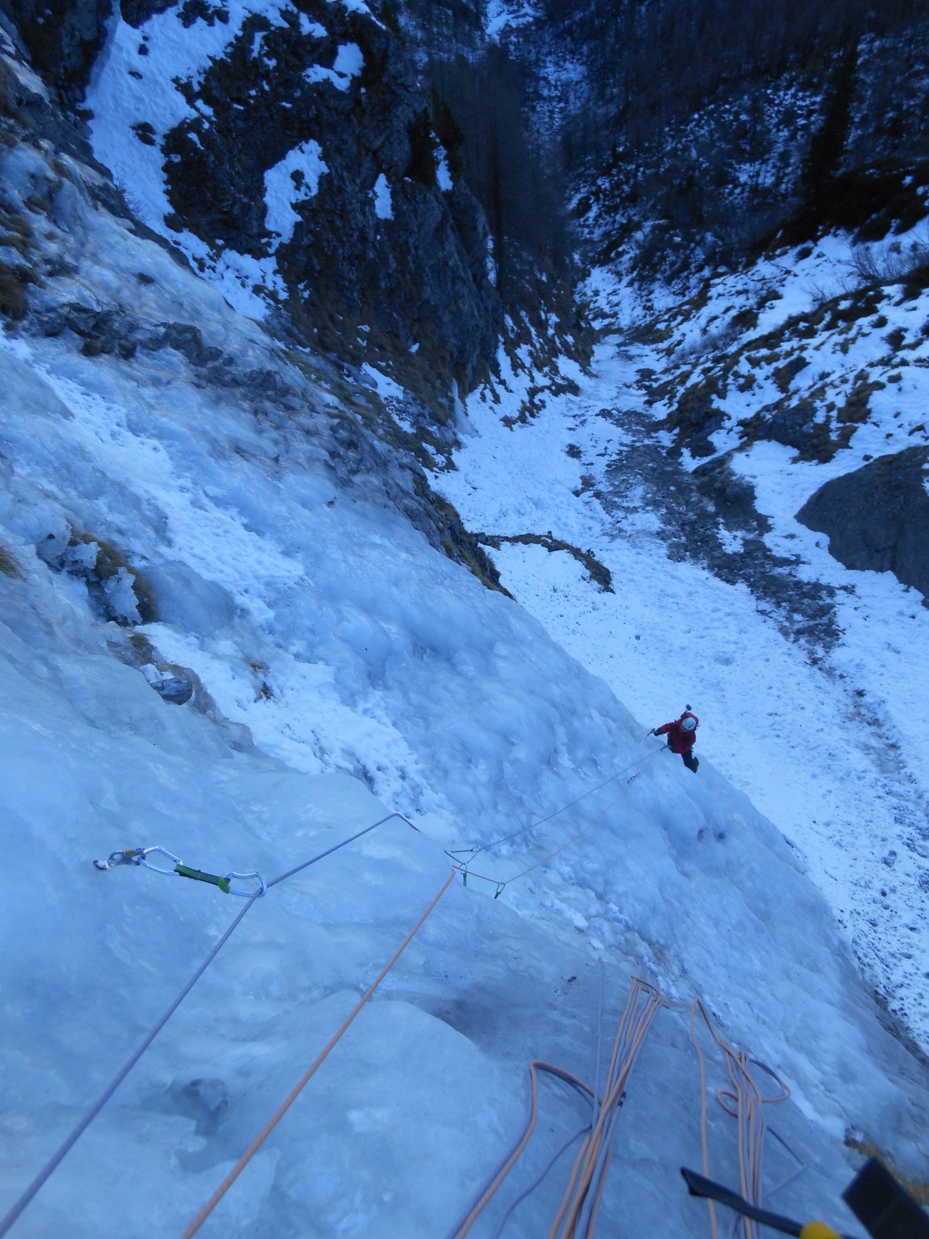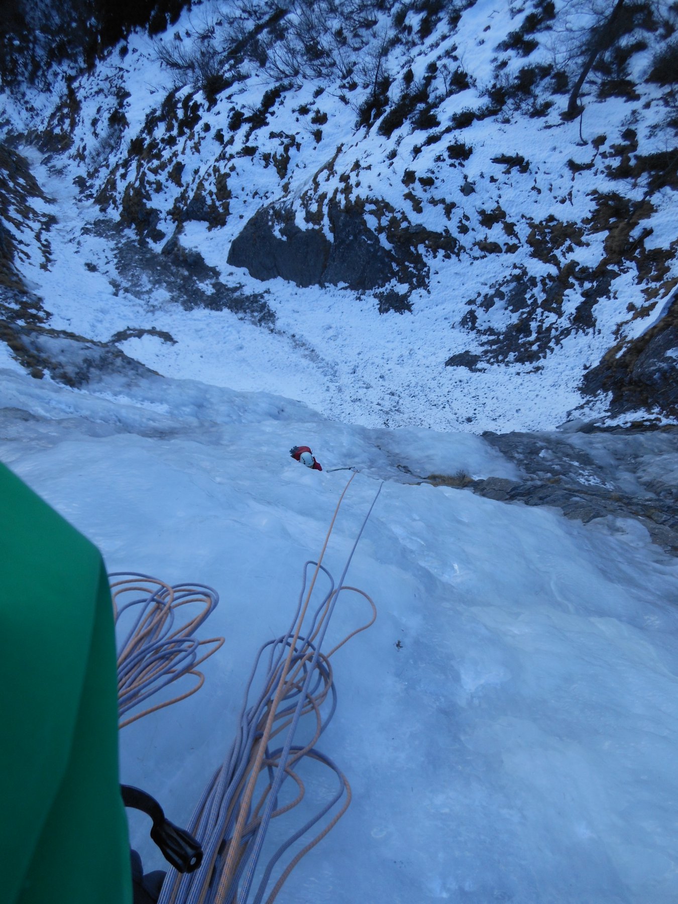 Si effettua in 3 tiri, attenzione a fare sosta alla base dell’ultimo risaltino perchè la sosta a cima cascata (cordino incastrato a dx, da integrare con friend 0.3) è a 58 metri.