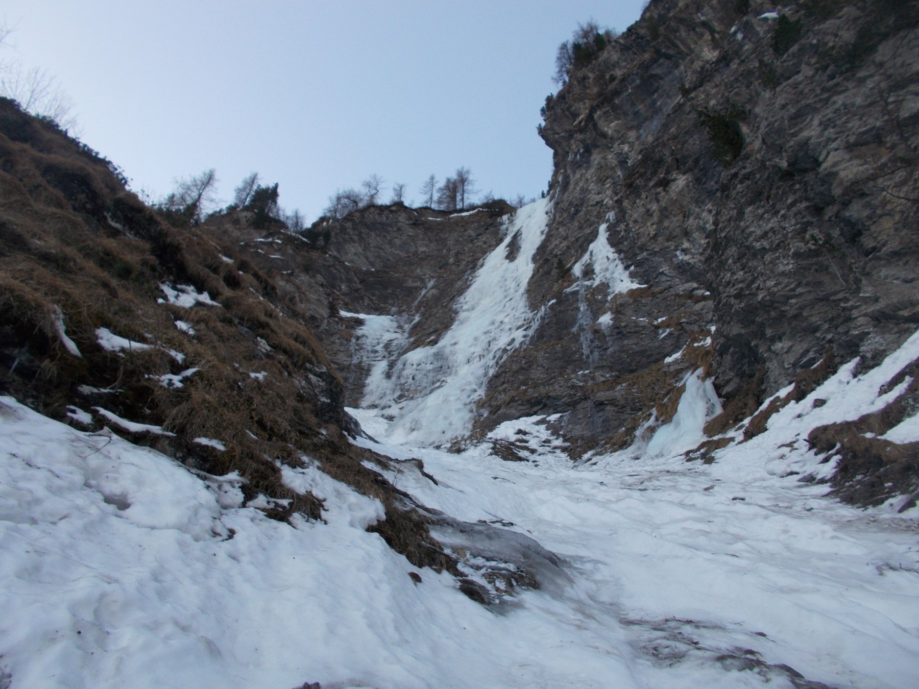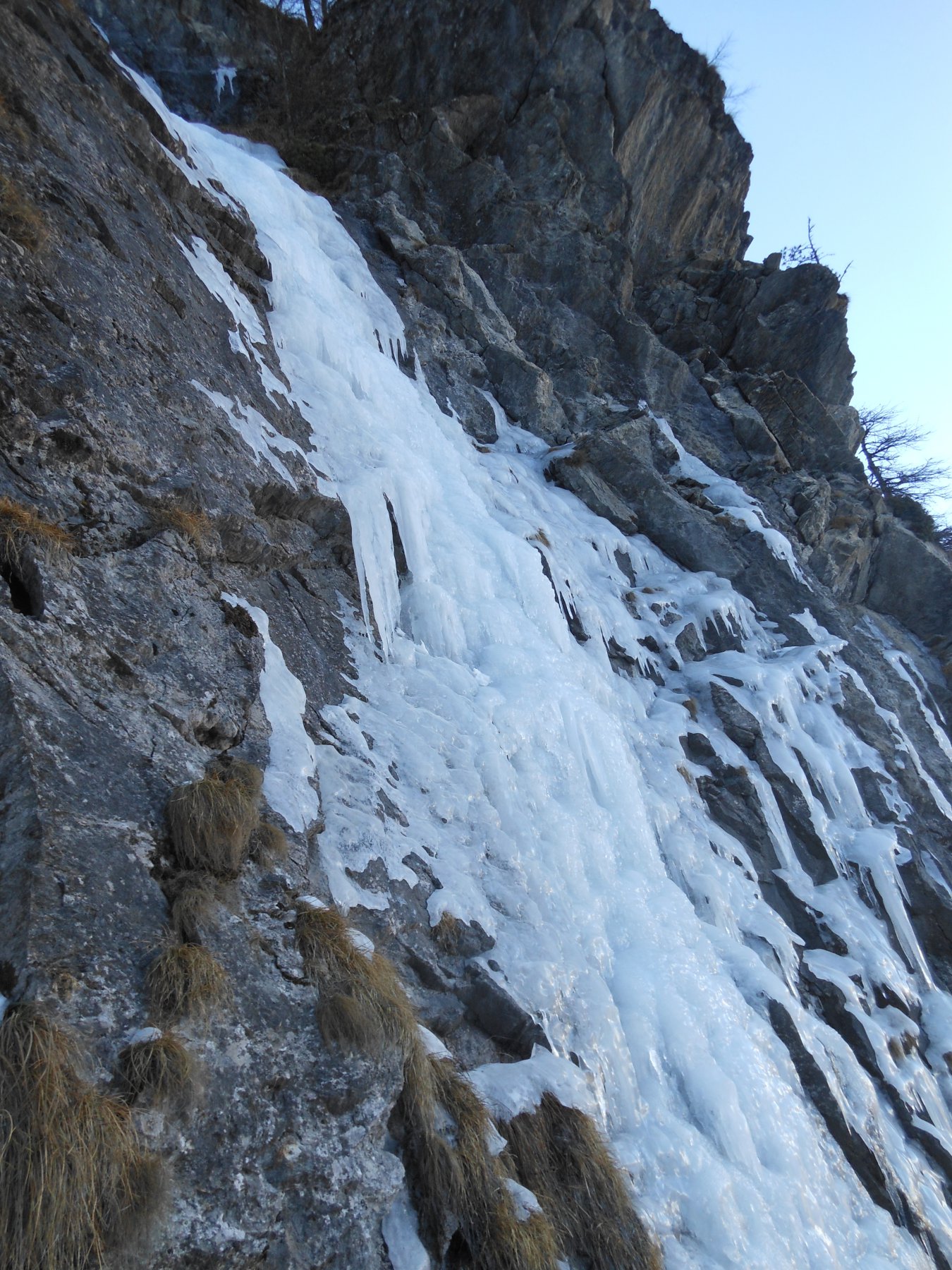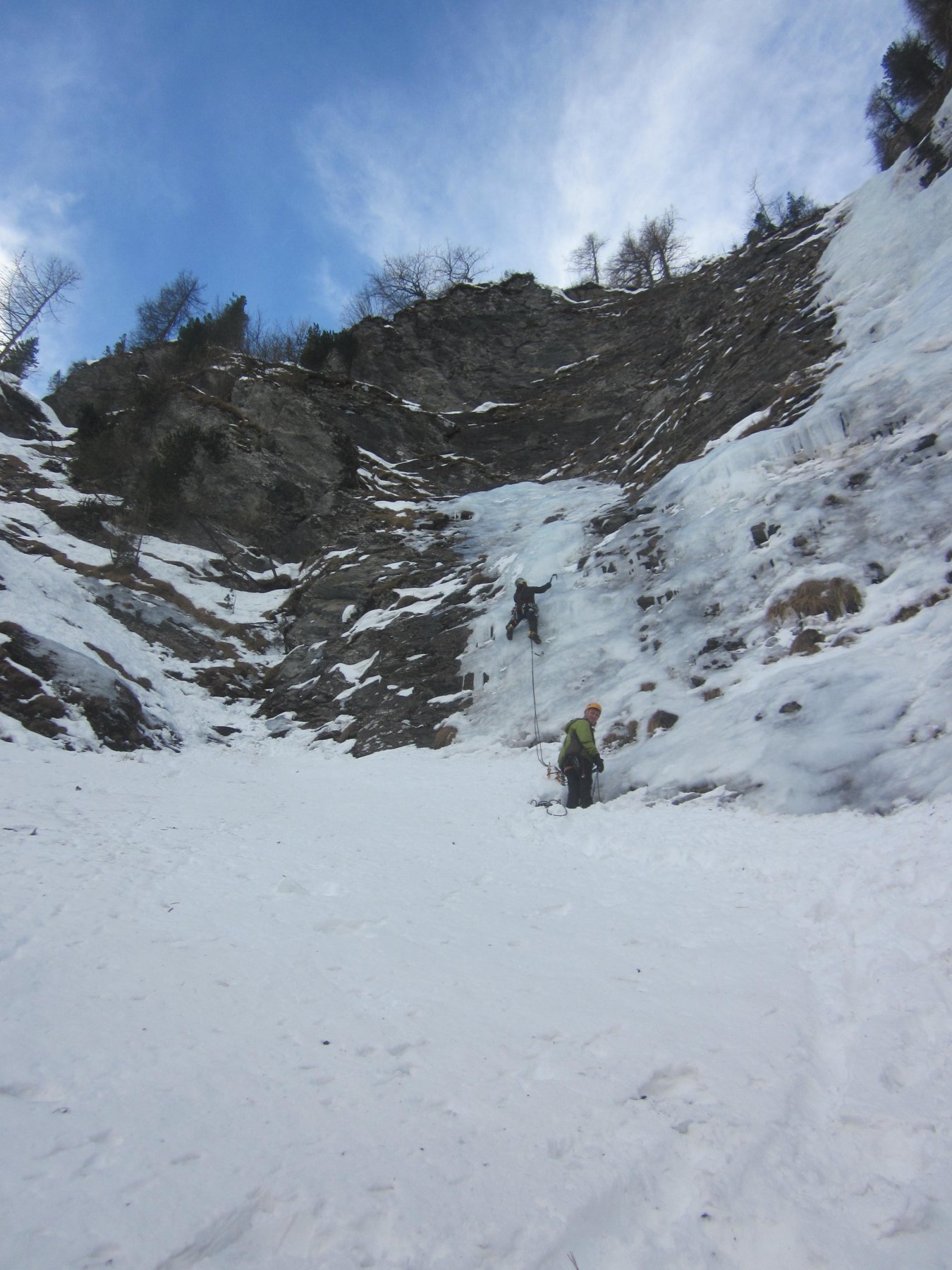 Lasciare quindi alla vostra destra la strada carrozzabile e seguire il torrente Cristove, per canale nevoso (se scarso innevamento, risaltini in ghiaccio-ruisseling) raggiungere la base della cascata.