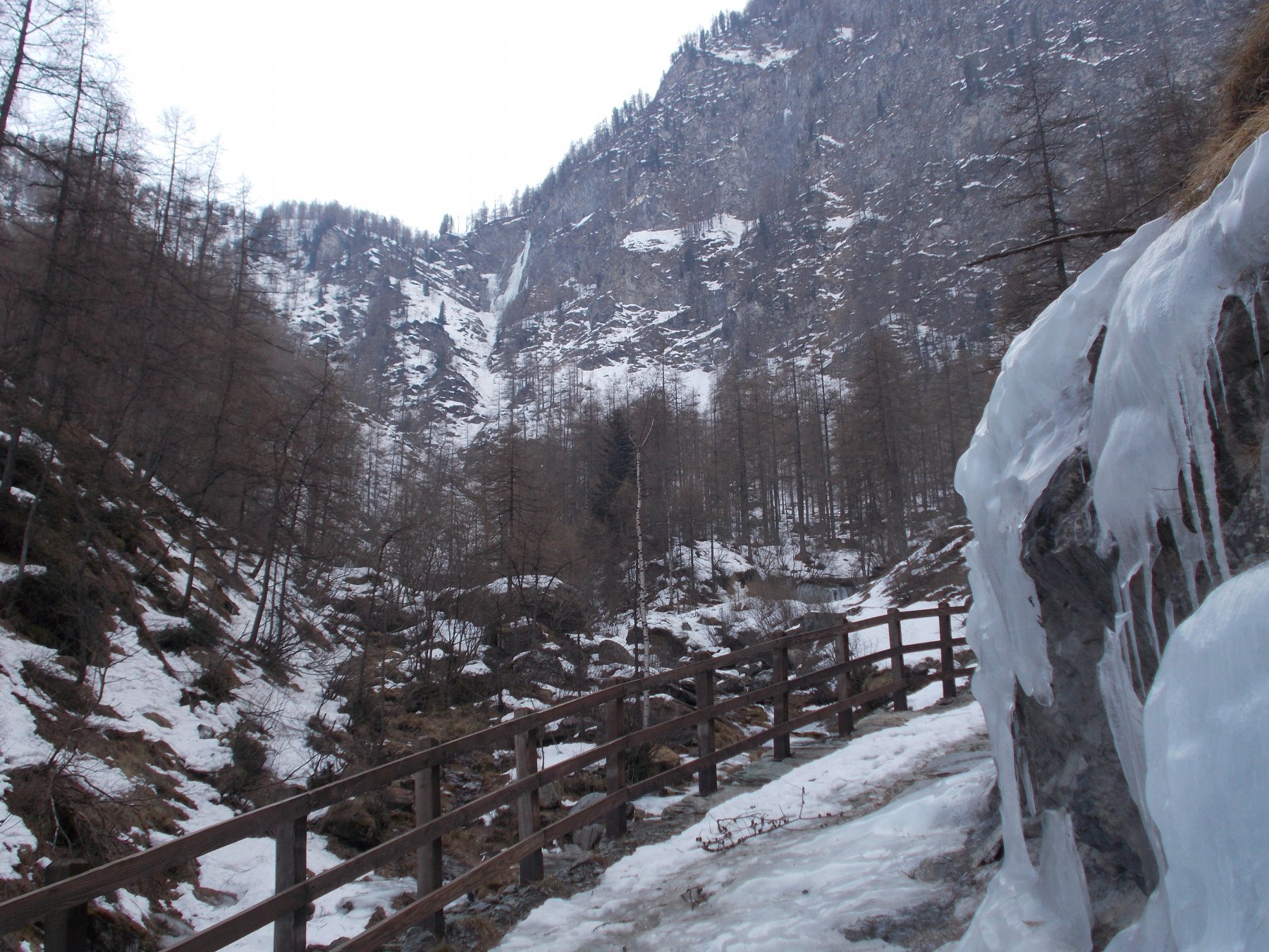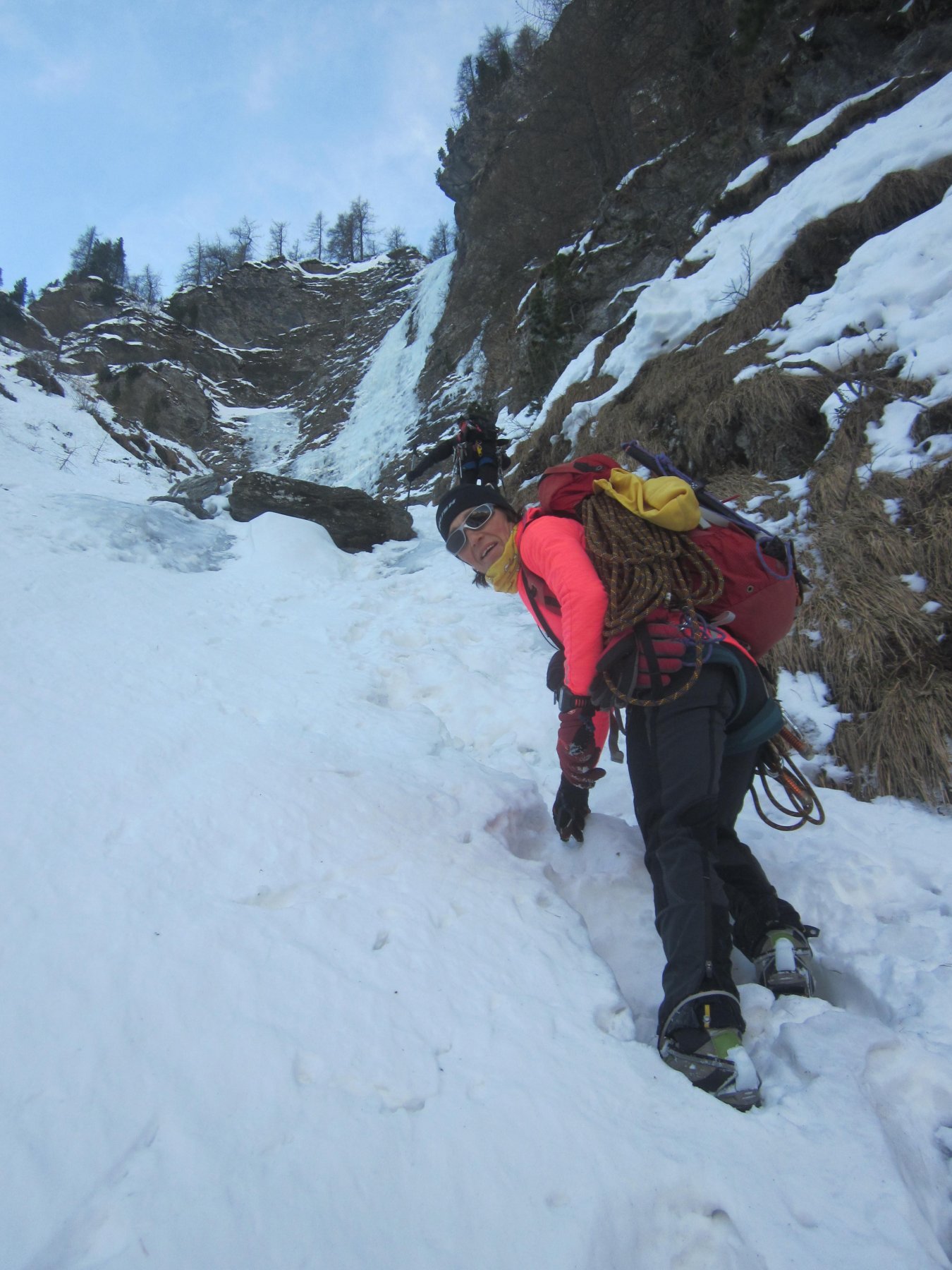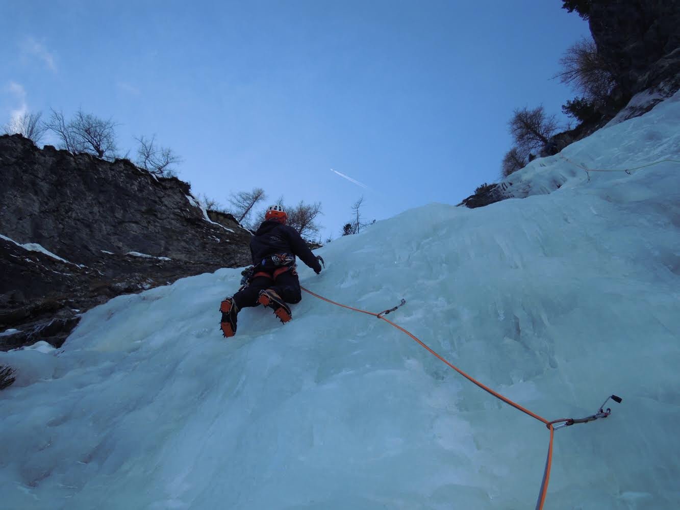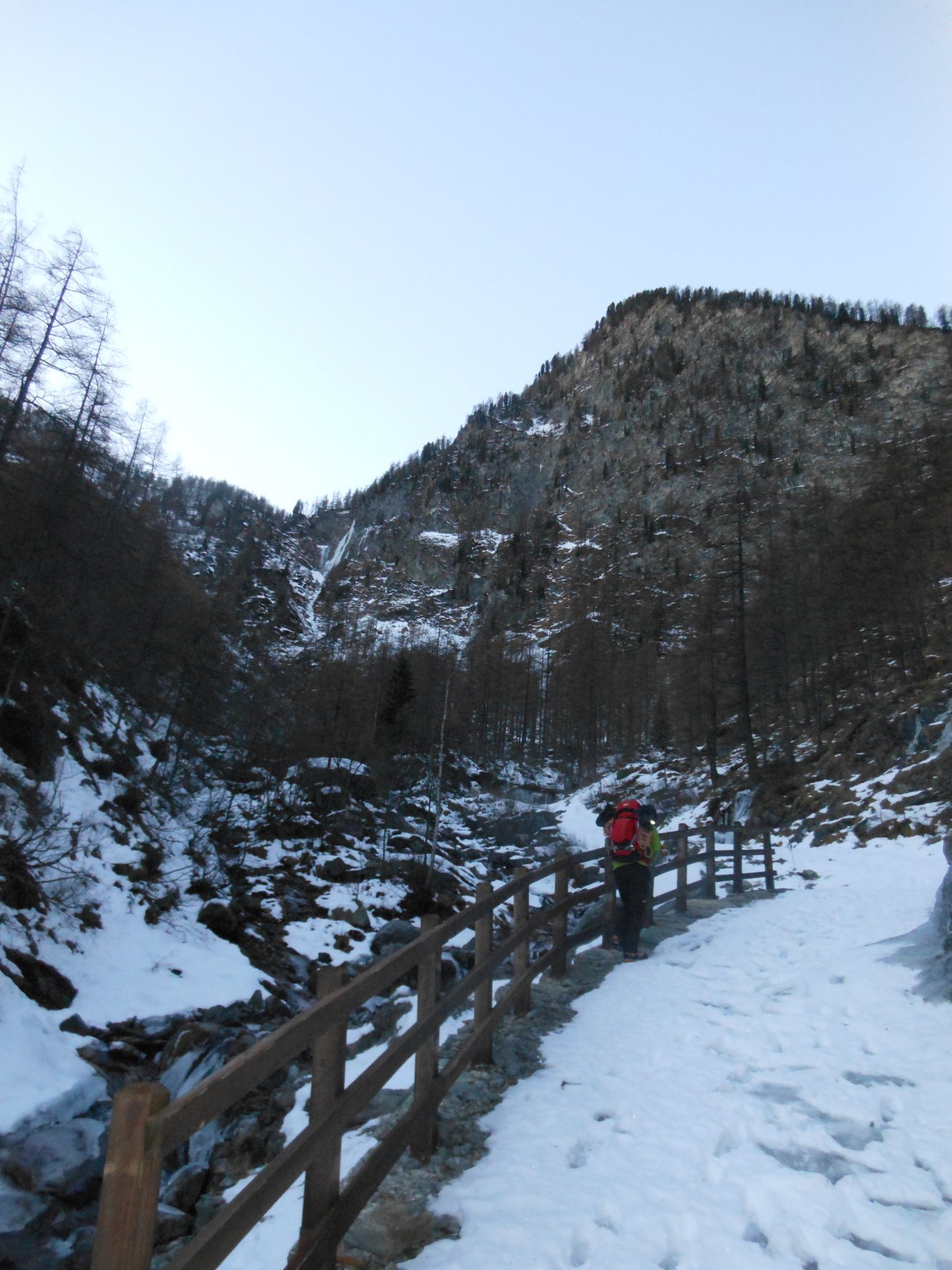 Lasciare quindi alla vostra destra la strada carrozzabile e seguire il torrente Cristove, per canale nevoso (se scarso innevamento, risaltini in ghiaccio-ruisseling) raggiungere la base della cascata.