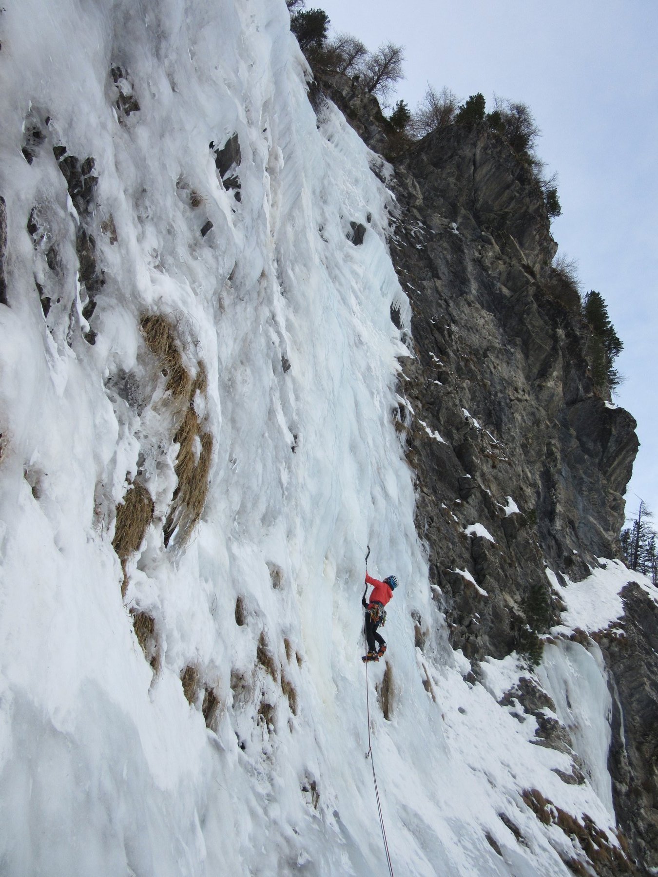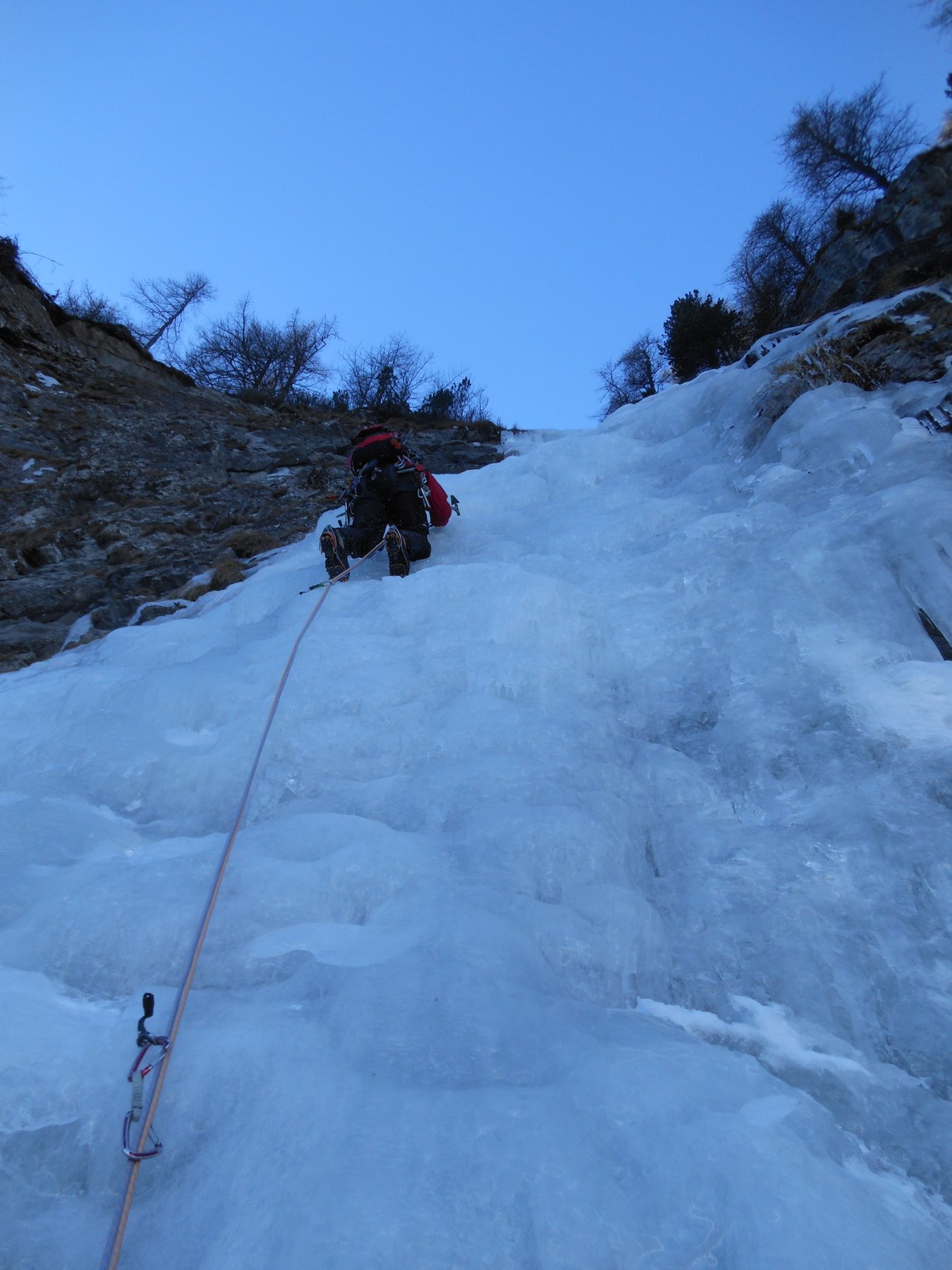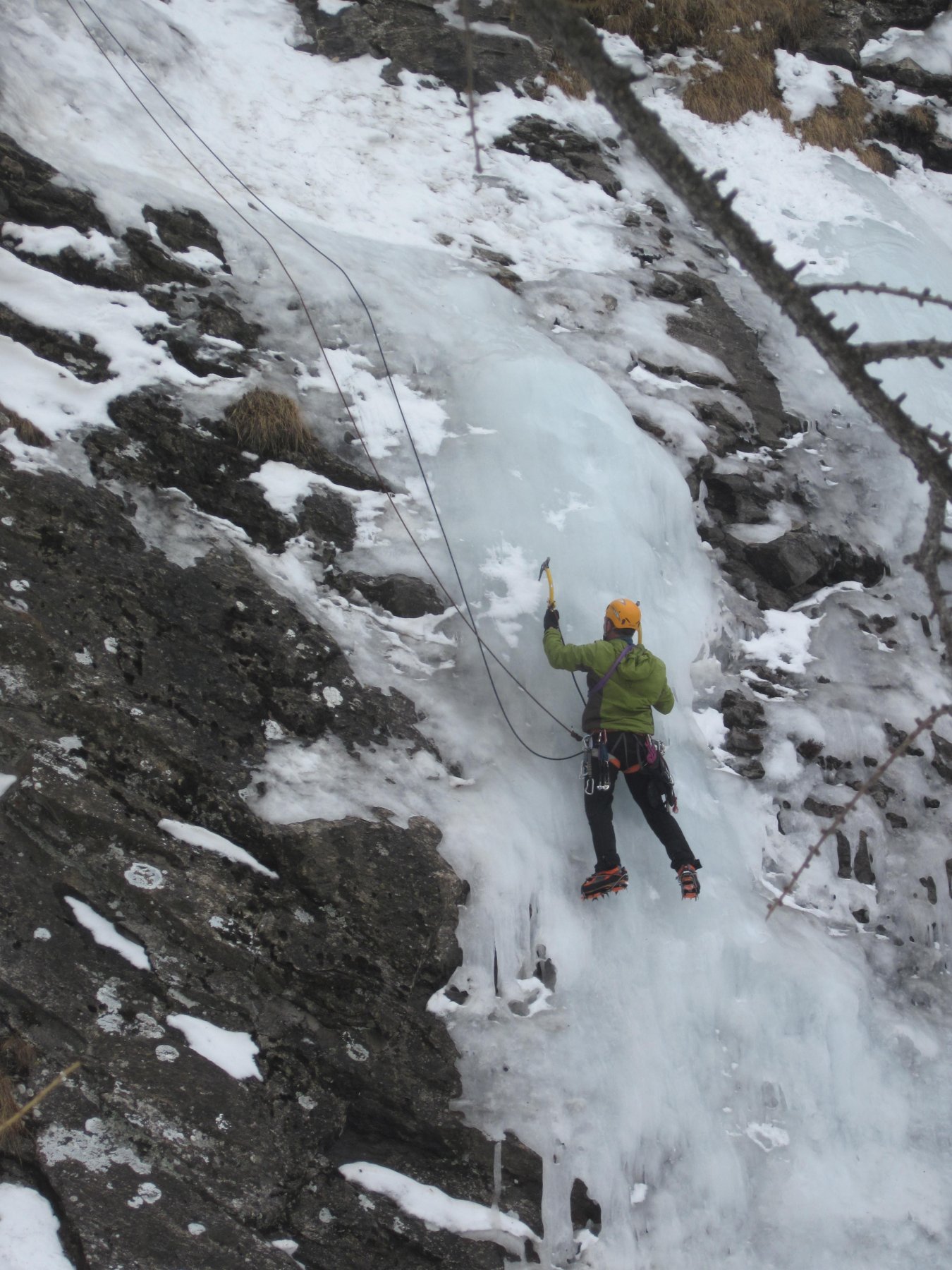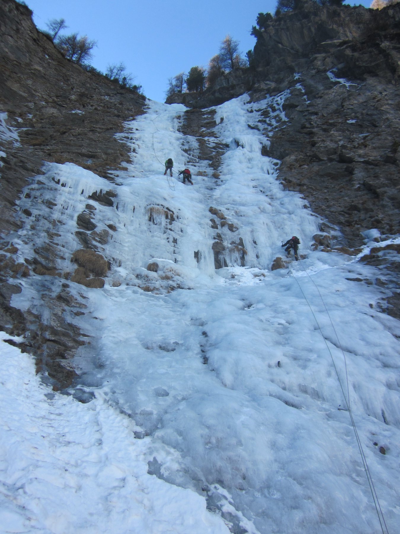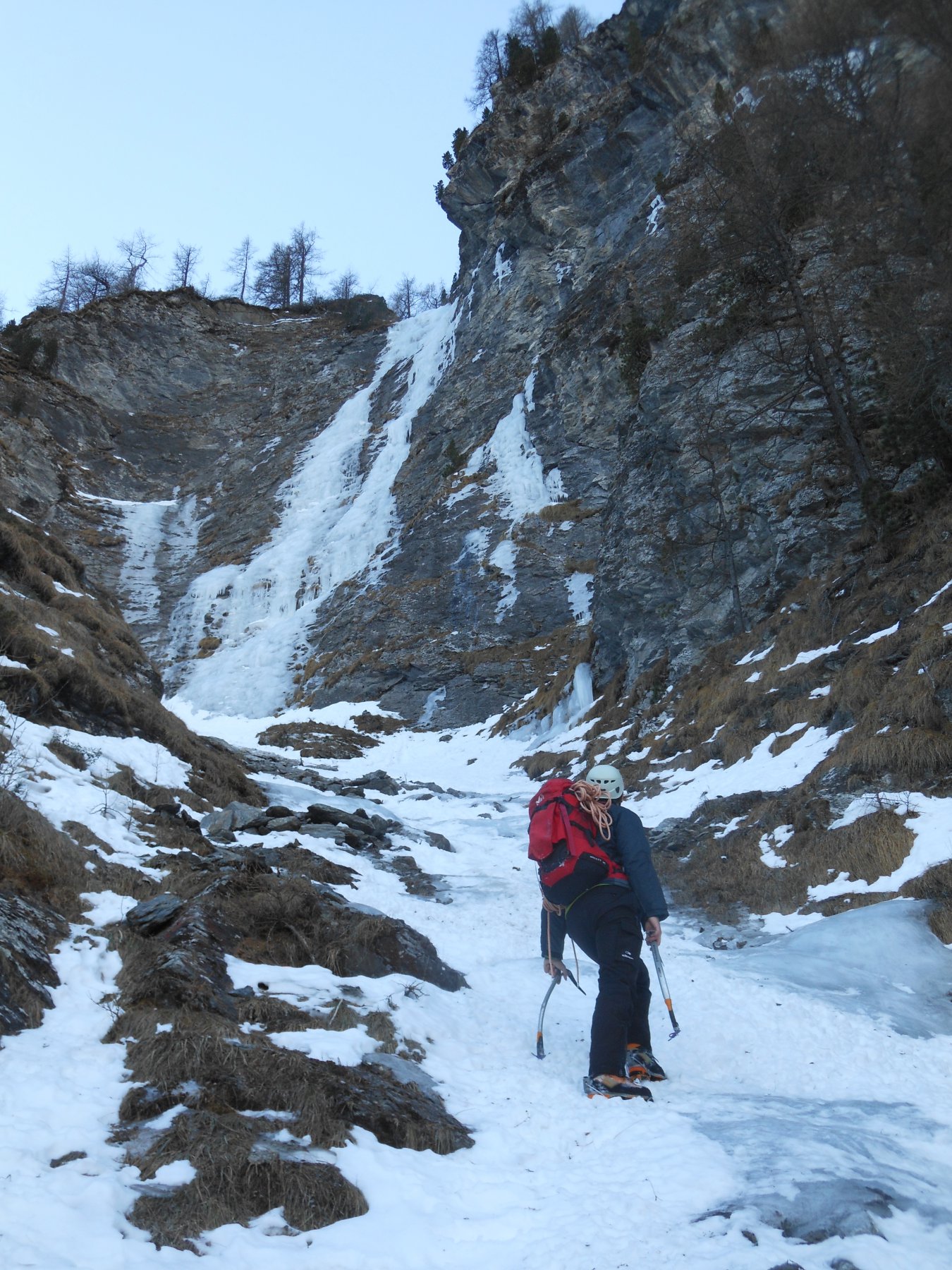La cascata è formata da quattro risaltini, il primo è il più impegnativo a causa del ghiaccio sottile e di un breve tratto verticale di 4 metri.