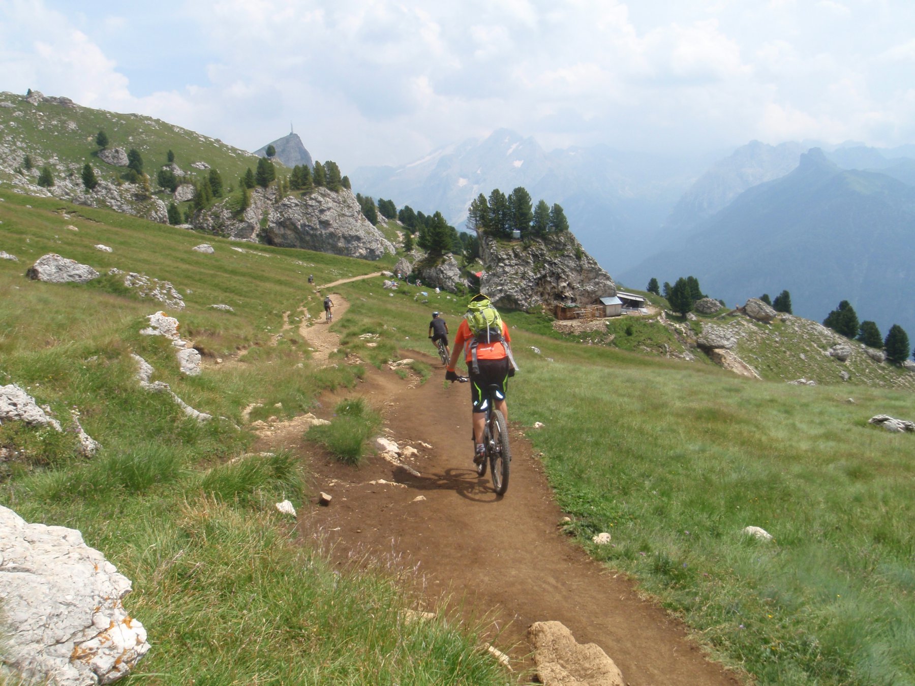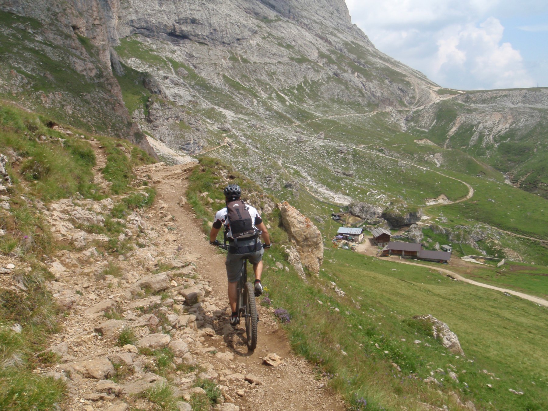 Alla fine del traverso, uno sterrato, ampio ma molto ripido, conduce al Rifugio Des Alpes, e poi alla cima, dove è posto il Rifugio Col Rodella.