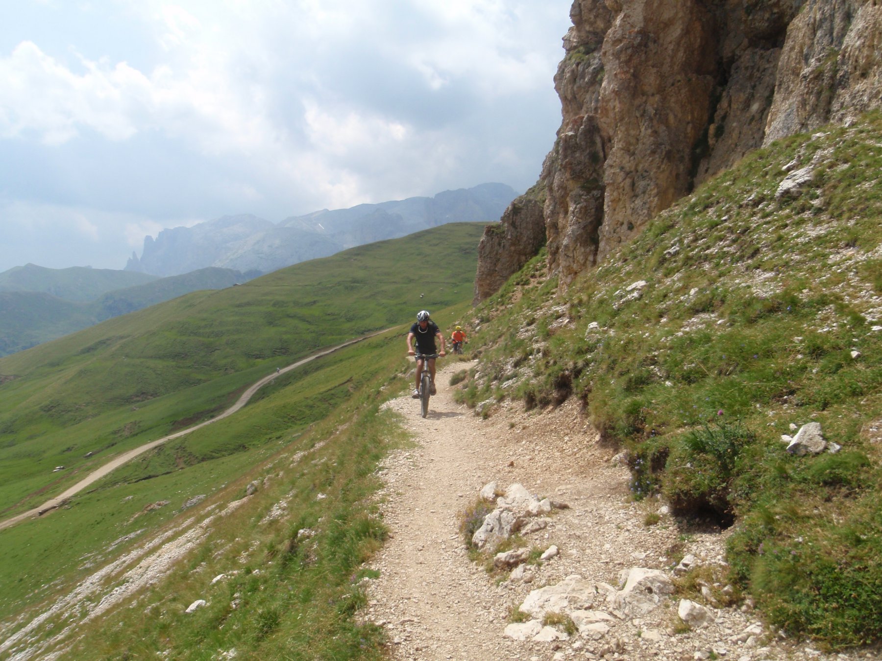 Finisce qui la salita vera e propria, ma meglio non illudersi, tutto il traverso, su dorsale molto panoramica sulla sottostante Val Duron da un lato e l’altopiano della Val di Siusi dall’altro, è un susseguirsi di sali e scendi, lungo un bellissimo sentiero ciclabile senza difficoltà rilevanti. (attenzione al primo e unico bivio lungo la traversata), non prendere il sentiero alla destra, facile, ma procedere per un breve tratto a spinta sulla sinistra per restare sul tracciato giusto. Dopo questo unico dubbio sul percorso, l’arrivo sotto la cima del Sasso Piatto e relativo rifugio, è puro divertimento, con continui cambi di paesaggio, conformazione del sentiero e scorrevolezza.