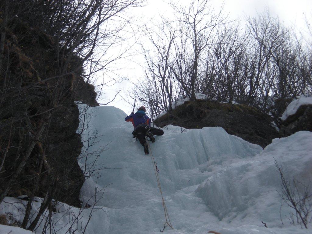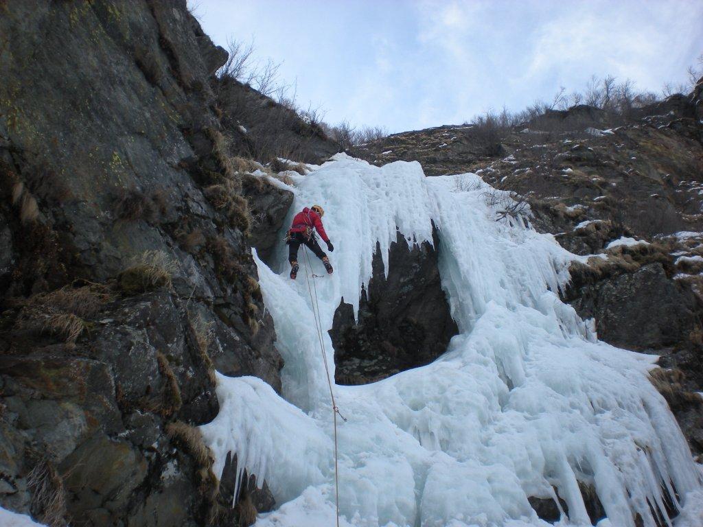 1°tiro: bel salto di circa 20mt con bella candela intensa sulla sx o muro più abbordabile sulla dx che sfociano in un facile pendio ghiacciato di altri 20mt sino alla base del tiro successivo. Sosta su abalakov.(40mt)