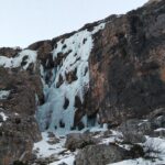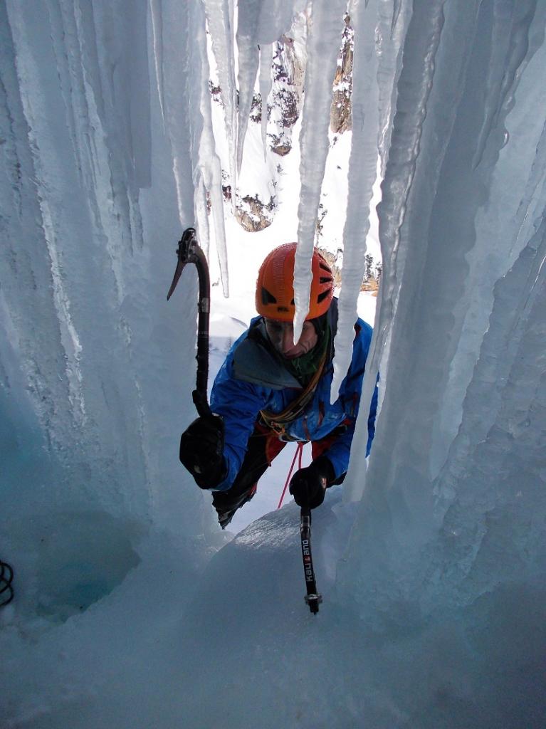 L2: salire la candela (o se non formata entrare nel camino per stretta colata di ghiaccio) ed uscire su placche inclinate che si risalgono fino a quando diventano più ripide (50 m)