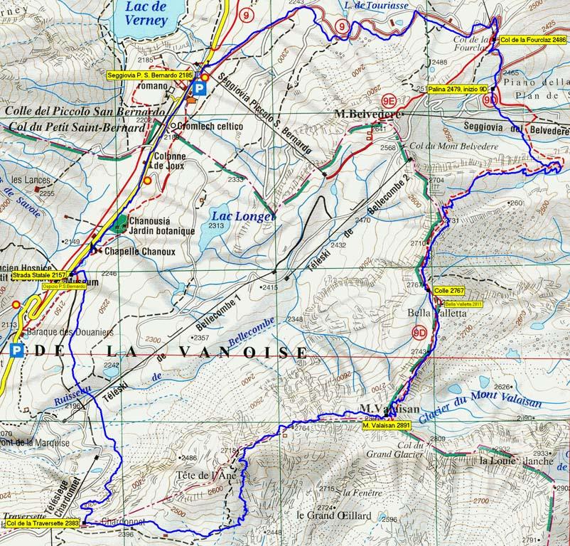 Dalla partenza della seggiovia del Piccolo San Bernardo, seguire il sentiero n° 9 per il col de la fourclaz 2486, proseguire fino ad incontrare una palina a q. 2479. Quindi seguire il sentiero n° 9D, che passando vicino alla Bella Valletta, porta in cima al M. Valaisan.