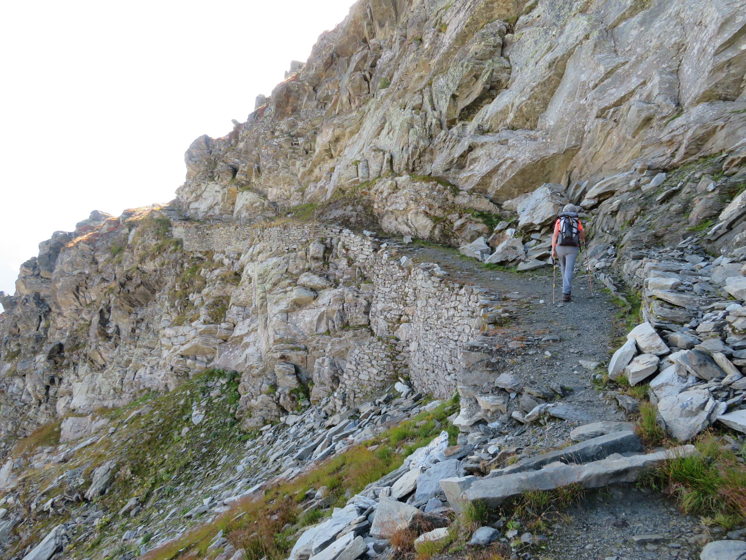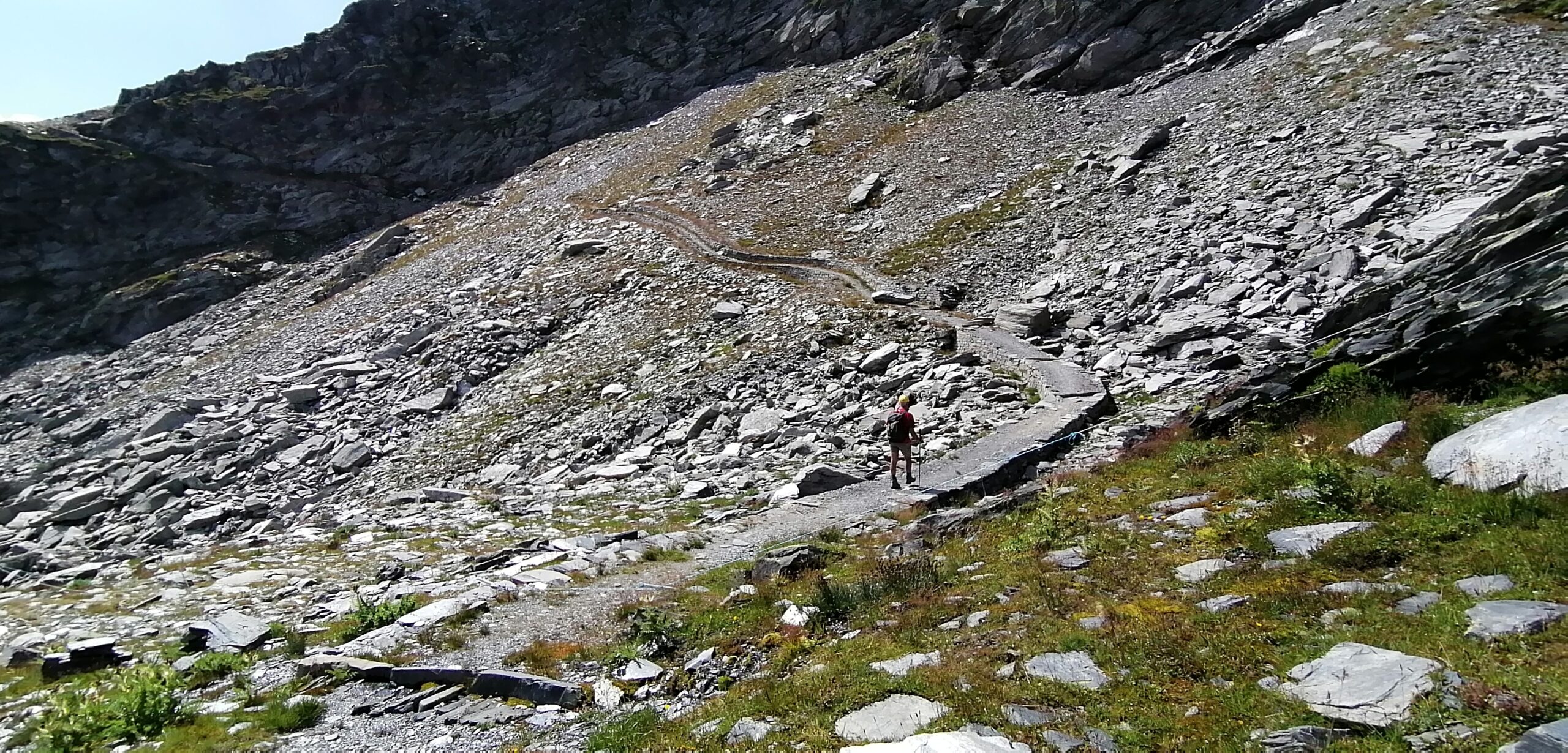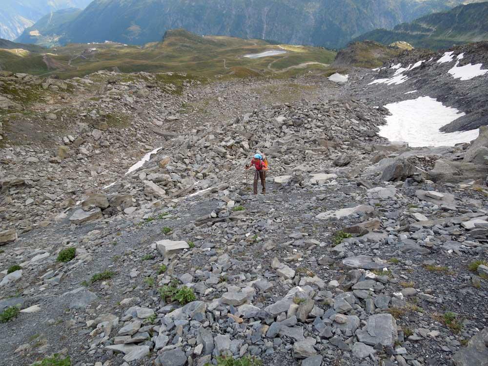 Dalla punta prendere verso Ovest (versante Francese)il sentiero (Attenzione, nei primi 40-50 m di dislivello il sentiero è ripido e esposto)che scende al col de la Traversette 2383. Da quì si scende alla strada statale nei pressi dell’ospizio, a 1,6 Km dalla partenza.