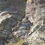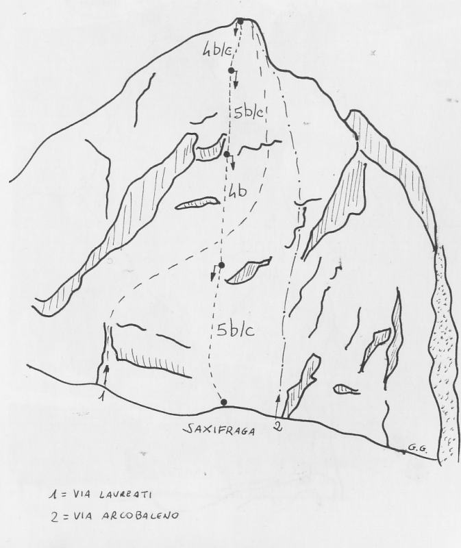 giungere al punto più basso della parete ( dove attacca autoritratto) , quindi ancora trenta metri a destra , al culmine di un ripido canaletto erboso. fix da 8 con fettuccia bianca visibile dal basso . ( tra autoritratto e quarantennio , vi è una via che corre su un bello sperone placcoso verdastro su cui vi sono 3 o 4 fix artigianali