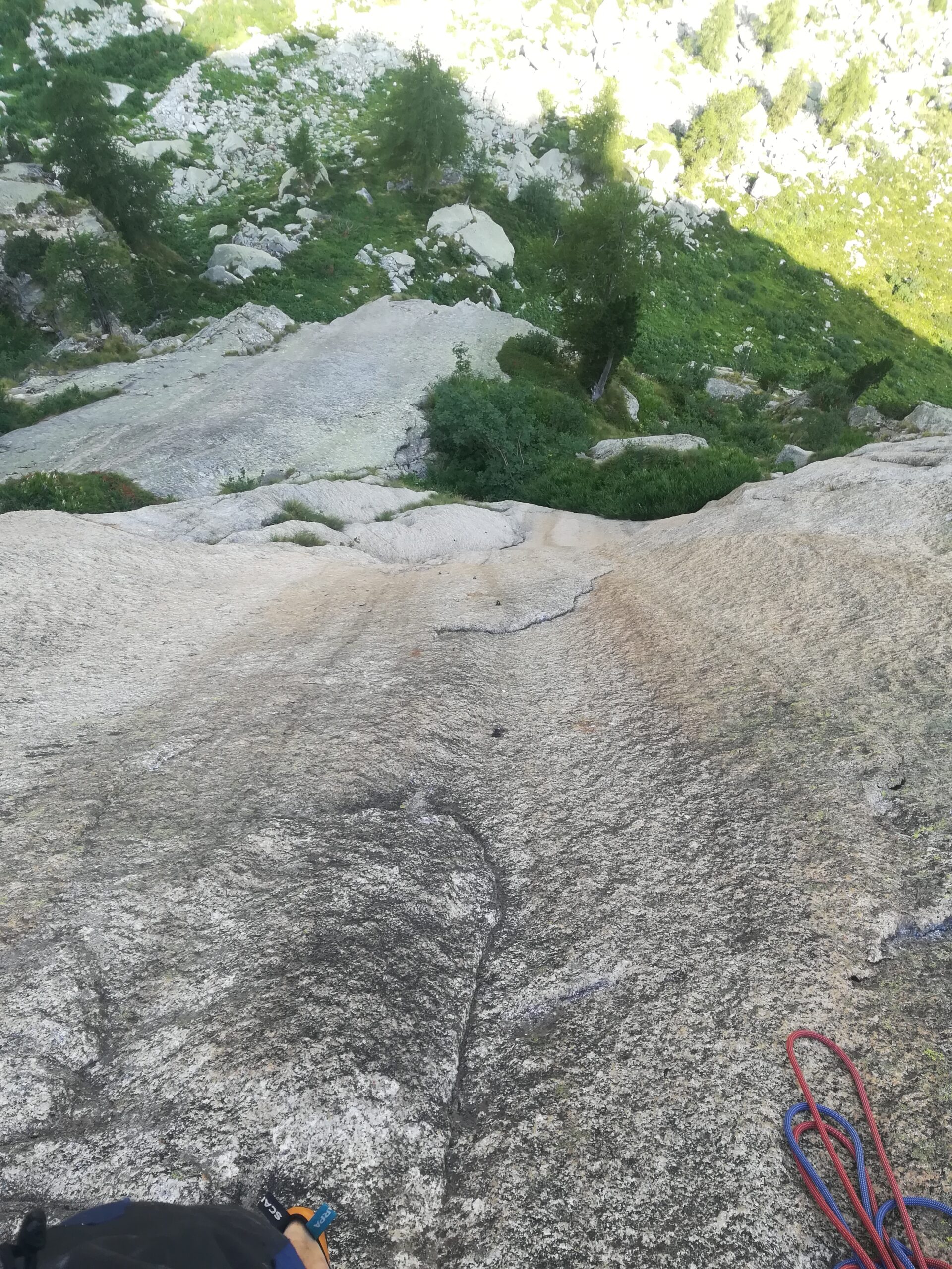 L2 6b spigoletto a prese franche, poi placca appoggiata di soli spalmi , chiodatura allungata.. viaggiare , sosta a sx su cengia
