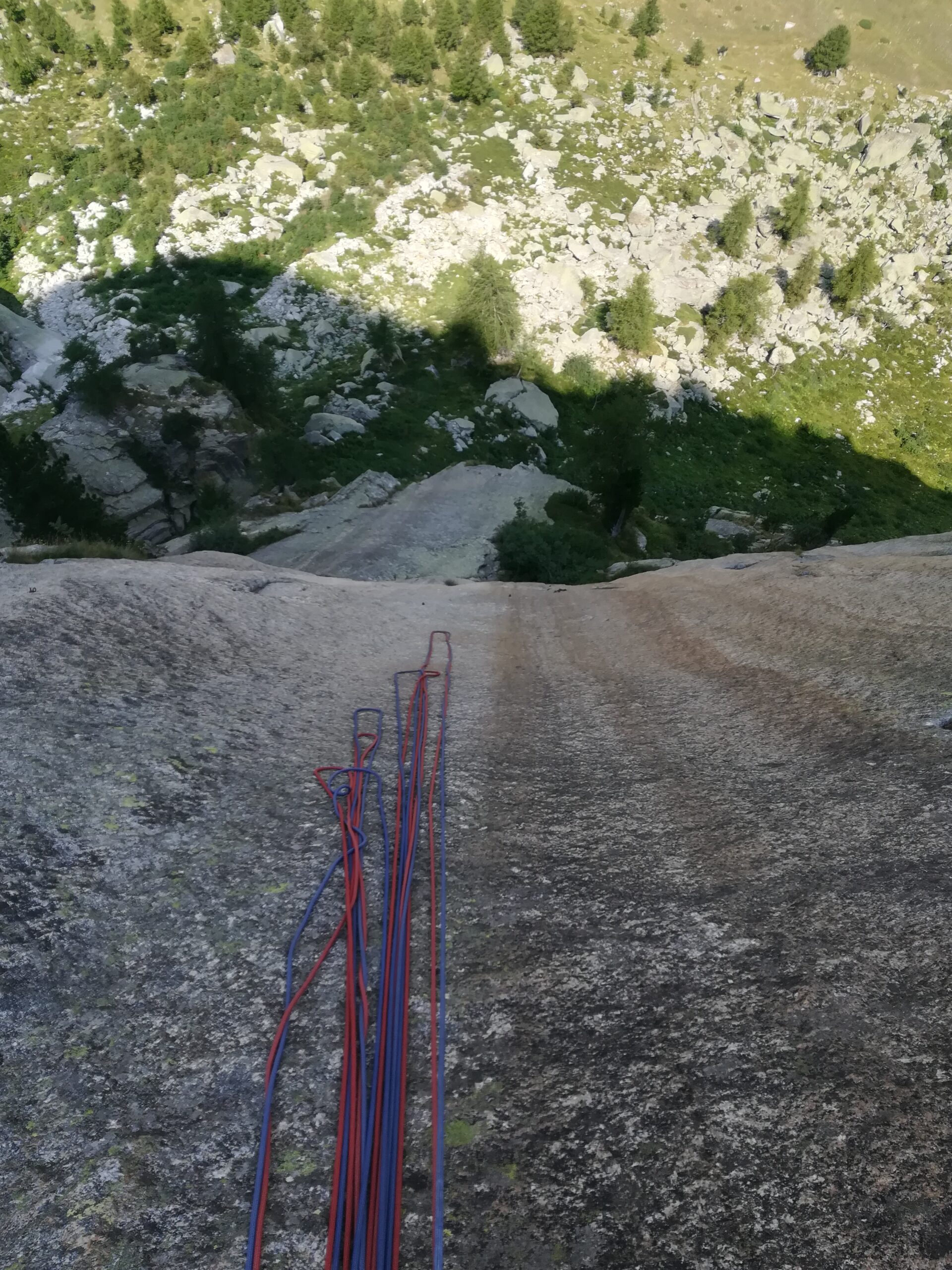 L5 6a muro e poi diedro (occhio al bagnato) , quindi simpatica dulfer sino alla sosta , posta sotto il muro finale
