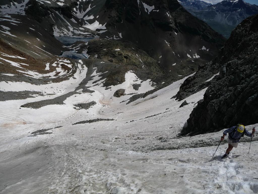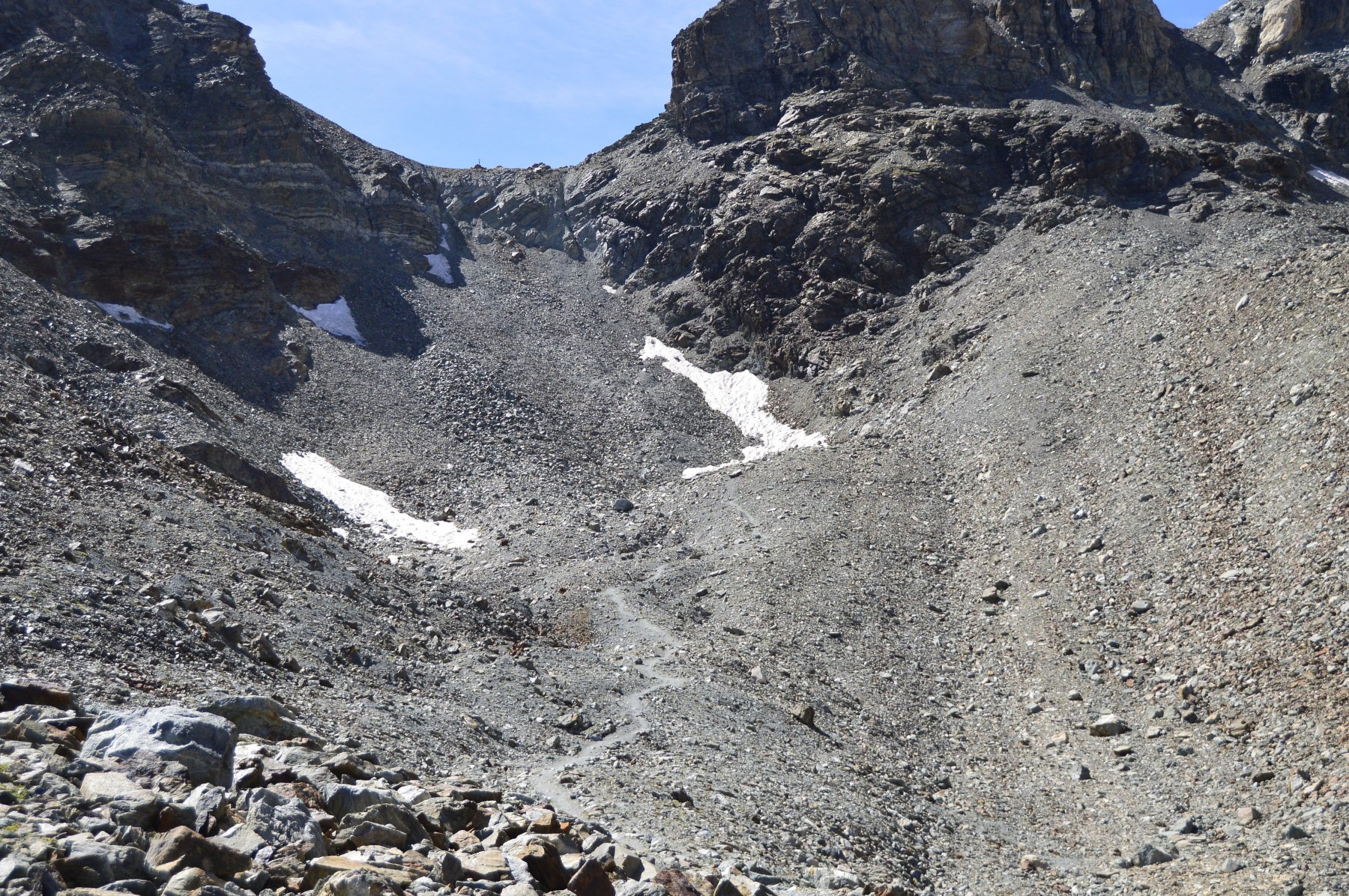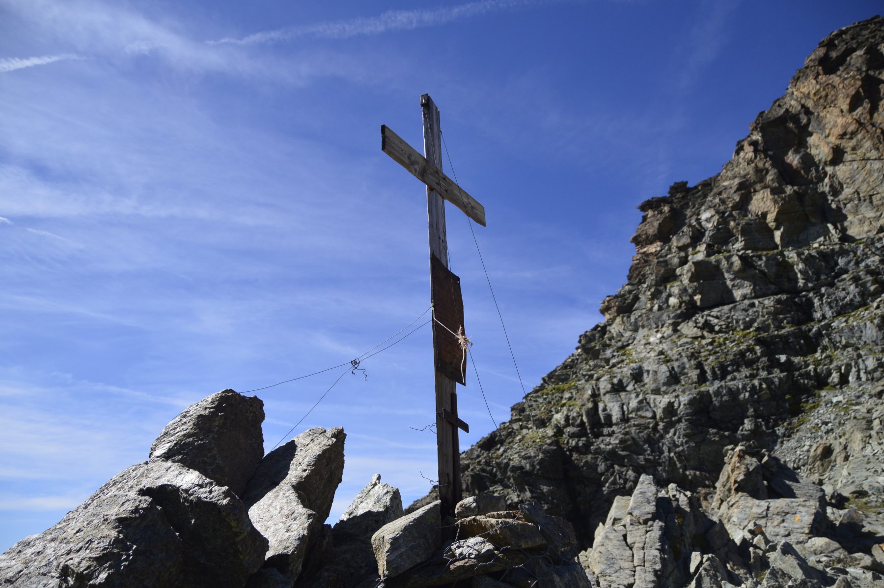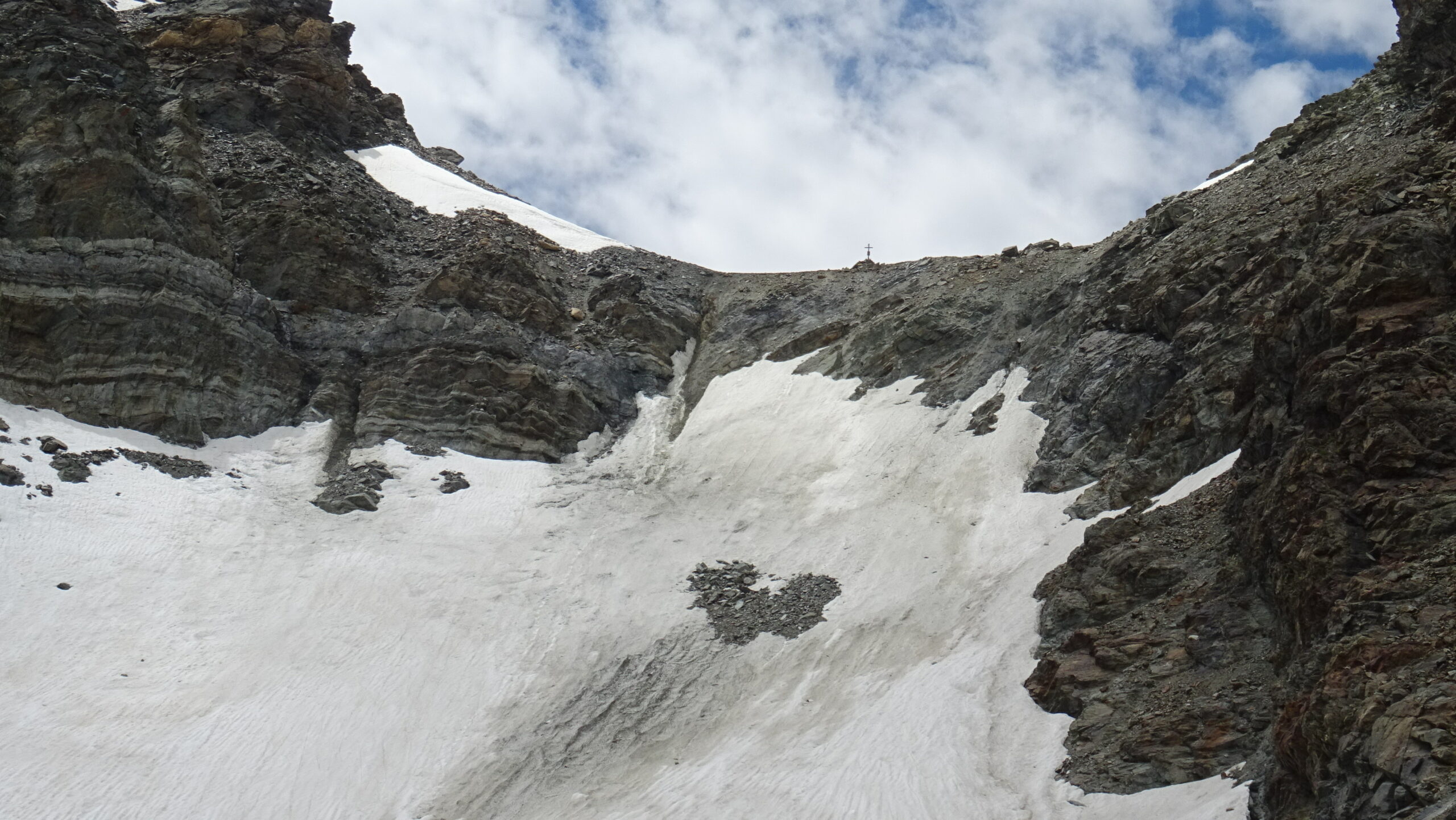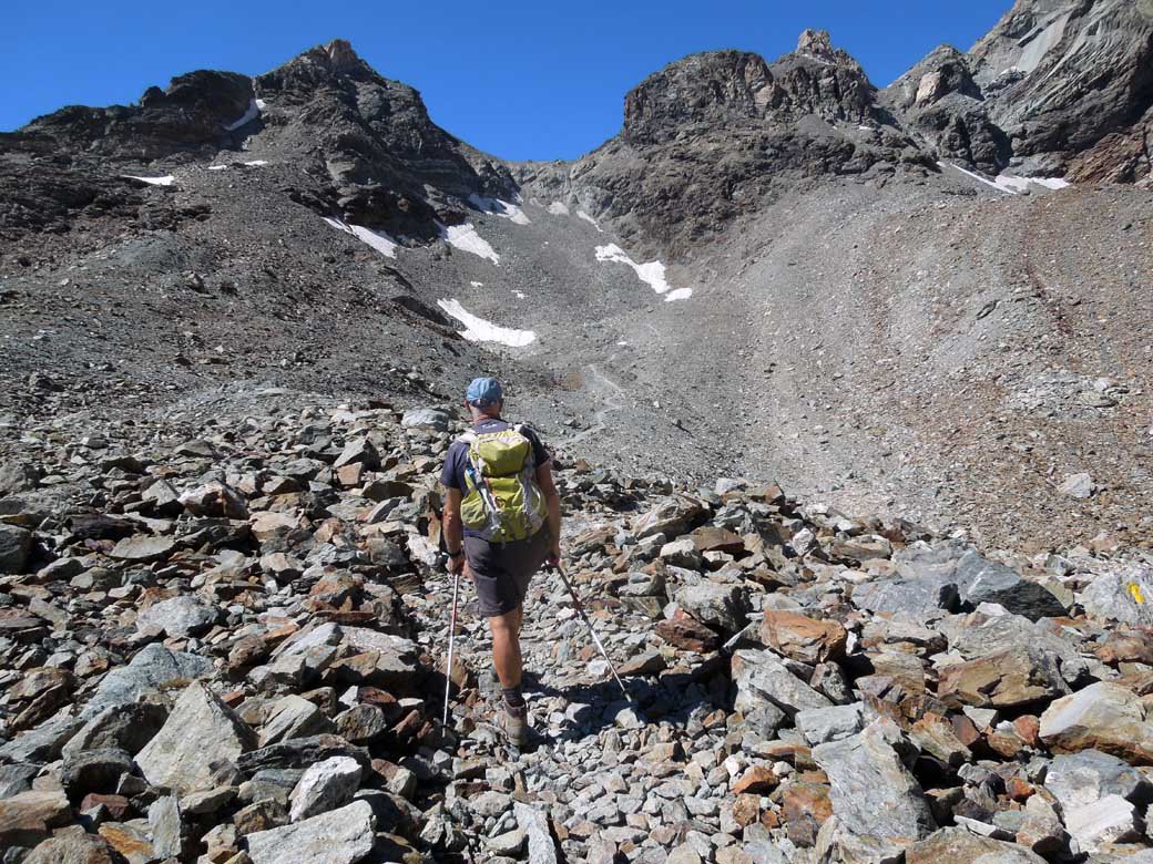 Da qui in circa mezzora al colle: noi abbiamo ancora trovato neve, e superato senza ramponi il ripido pendio terminale. Sul colle, collegamento colla Valpelline, una grossa croce