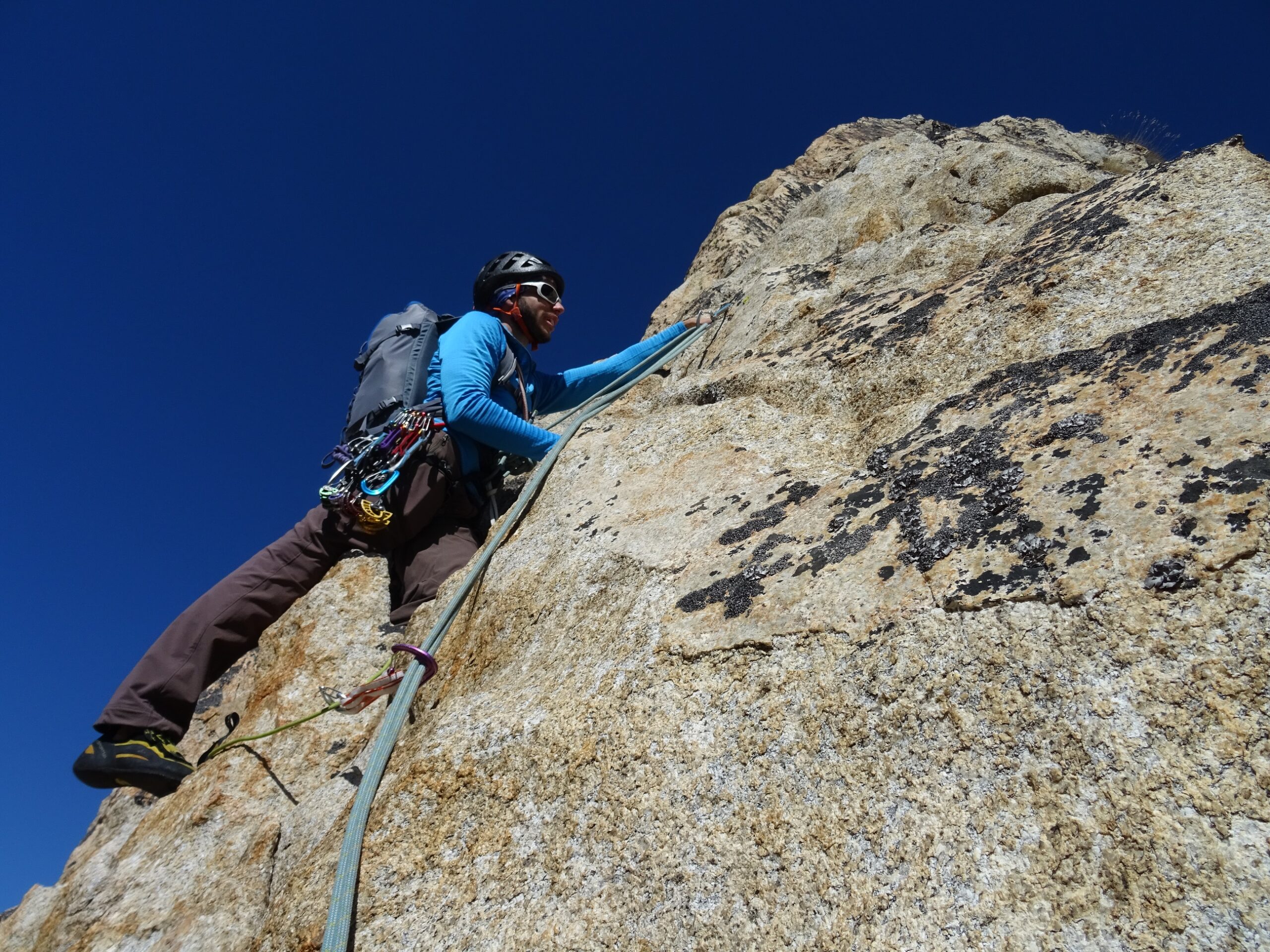 Come già detto la via si svolge su un granito entusiasmante; i chiodi in posto sono sicuri e al punto giusto, solamente spesso si confondono con la roccia e non sono ben visibili, come su L3 (le possibilità di protezione sono comunque sempre abbondanti). Dopo la “rivisitazione” su L3 e la rimozione della lama pericolante torna utile un friend in partenza. S3 davvero scomoda. Dopo L4 abbiamo proseguito in scarponi in conserva protetta sulla dentellata e divertente cresta finale. Sicuramente degne di nota le due fessure che si incontrano all’inizio e alla fine. Materiale usato: una mezza da 60m usata doppiata, friend #0.3-2 BD (il 3 torna utile per le sopracitate fessure della cresta finale), qualche nut, qualche fettuccia. Martello utile ma non indispensabile.