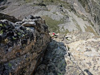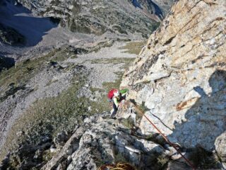 Abbiamo tolto le scarpette per i tiri sulla cresta ma forse era meglio tenerle, le difficoltà calano ma spariscono quasi completamente le protezioni, comunque ci sono dei passi di IV e la roccia è meno solida.