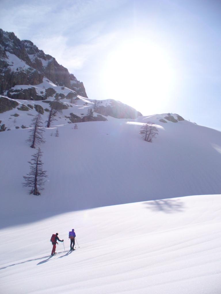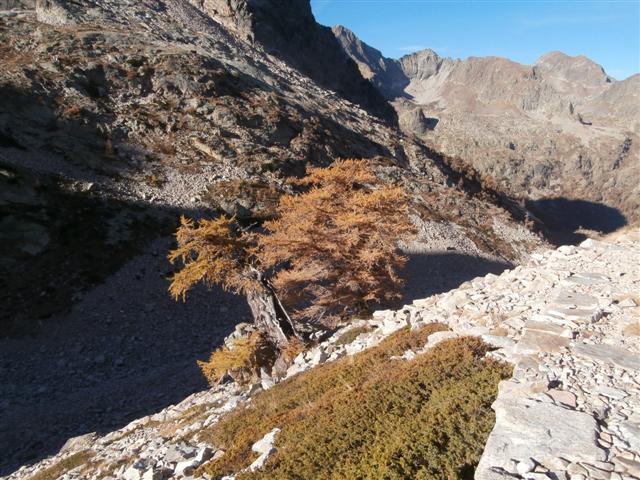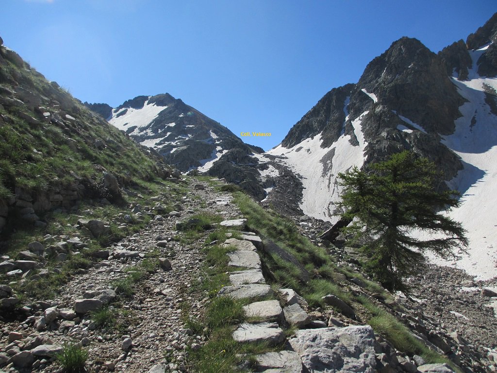 Si prosegue sulla carrareccia attraversando il Piano,si supera il torrente sopra un ponte con tavole di legno e subito si incrocia il bivio(palina) dove si deve girare a sx seguendo le indicazioni Colletto del Valasco,ora si prosegue su sentiero che entra in un bosco di larici e sale a tornanti fino ad incrociare a quota 2121 l’ex carrareccia militare proveniente dalla lontana Valscura (palina). Si continua seguendo le indicazioni per il Colletto Valasco fino a q.2300 ca (grande masso sulla dx,un palo di legno del telegrafo militare,un piccolo stagno) dove si abbandona la mulattiera per puntare sulla sinistra (ometto) verso un ripido canale (erboso nella parte alta, caratteristico masso incastrato alla base) che sbuca a sinistra della q.2605.