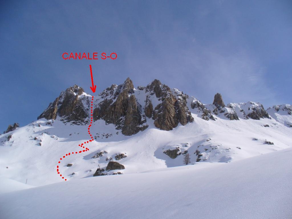 Per ripido pendio si raggiunge la base del canale, si supera il masso incastrato sulla destra su rocce miste a erba (F). Oltre l’ostacolo iniziale si entra nel canale, e per gradini rocciosi e levigati (II-), si raggiunge il pendio erboso soprastante. Con prudenza si continua fino ad un modesto colletto aperto sulla Valcuca. A questo punto si percorre verso destra il filo di cresta che porta su un’anticima poco più bassa della vetta (II-). Si scende su una forcellina, quindi, tra grossi blocchi rocciosi e un breve diedro (II) si raggiunge la piccola cima.