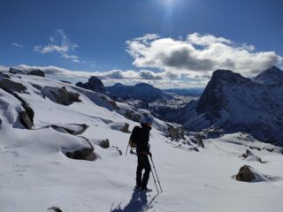 Condizioni di neve veramente buone siccome ha rigelato e le temperature sono basse. Tratto con le catene pulito. La neve inizia alla bocca della rossa a quota 2400 metri. Il traverso dal passo della rossa al passo crampiolo è un po’ ghiacciato per cui sono consigliati i ramponi. Si prosegue bene fino al passo del mittelberg su neve leggermente più pesante ma quasi mai sfondosa. Dal passo verso la cima la quantità di neve diminuisce drasticamente a causa forse dell’azione del vento, e quindi bisogna prestare attenzione visto i sassi. Il rischio di cadere dentro qualche buco è abbastanza elevato. Ultimo tratto da fare con attenzione visto un po’ l’esposizione. Vetta stretta e precipite da ogni lato. Discesa invece abbiamo optato per scendere dalla stessa via. Circa 1500 metri di dislivello positivo