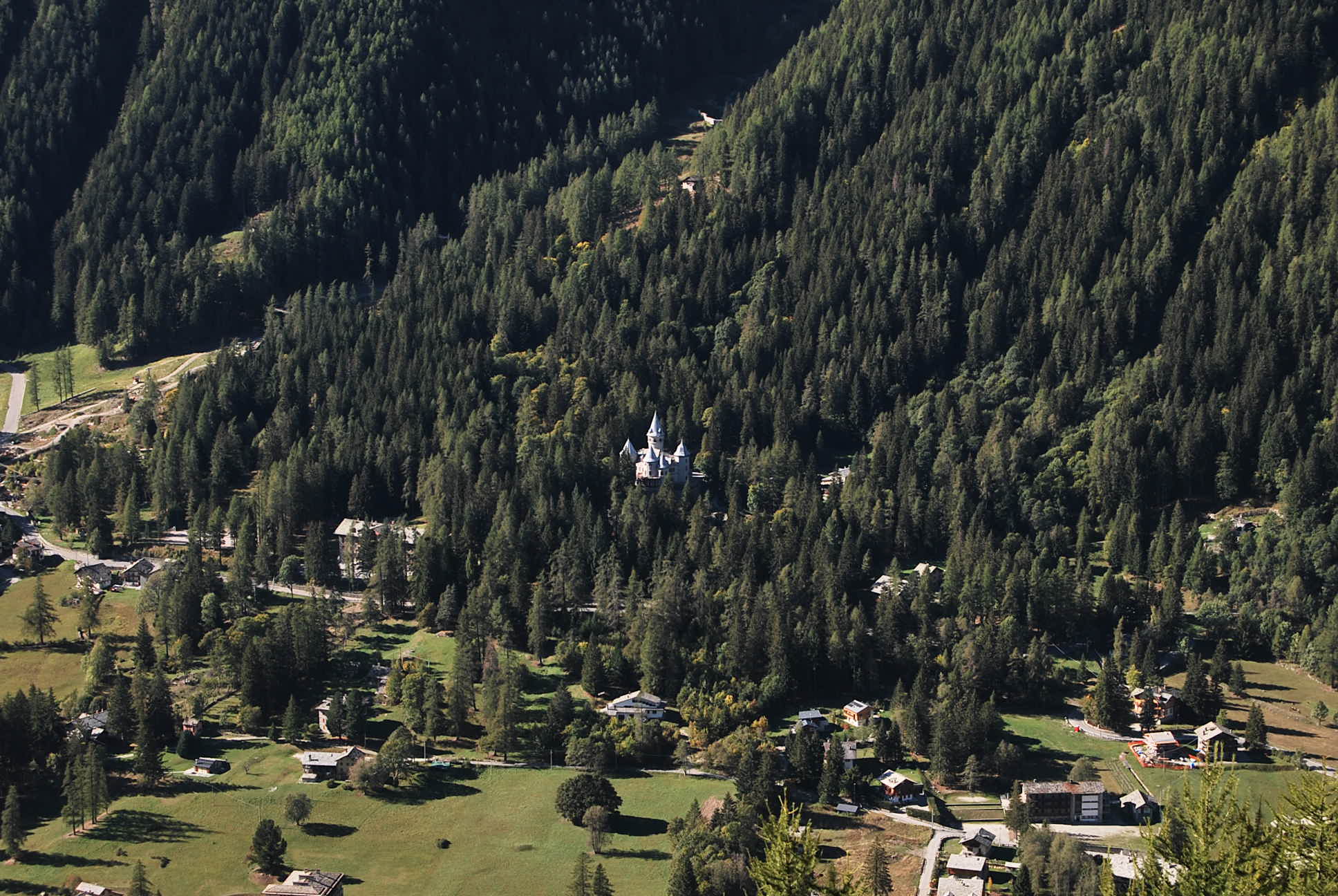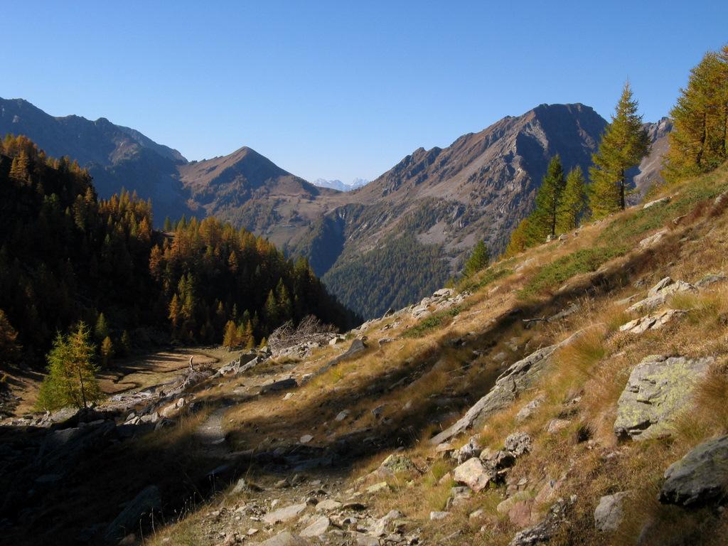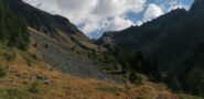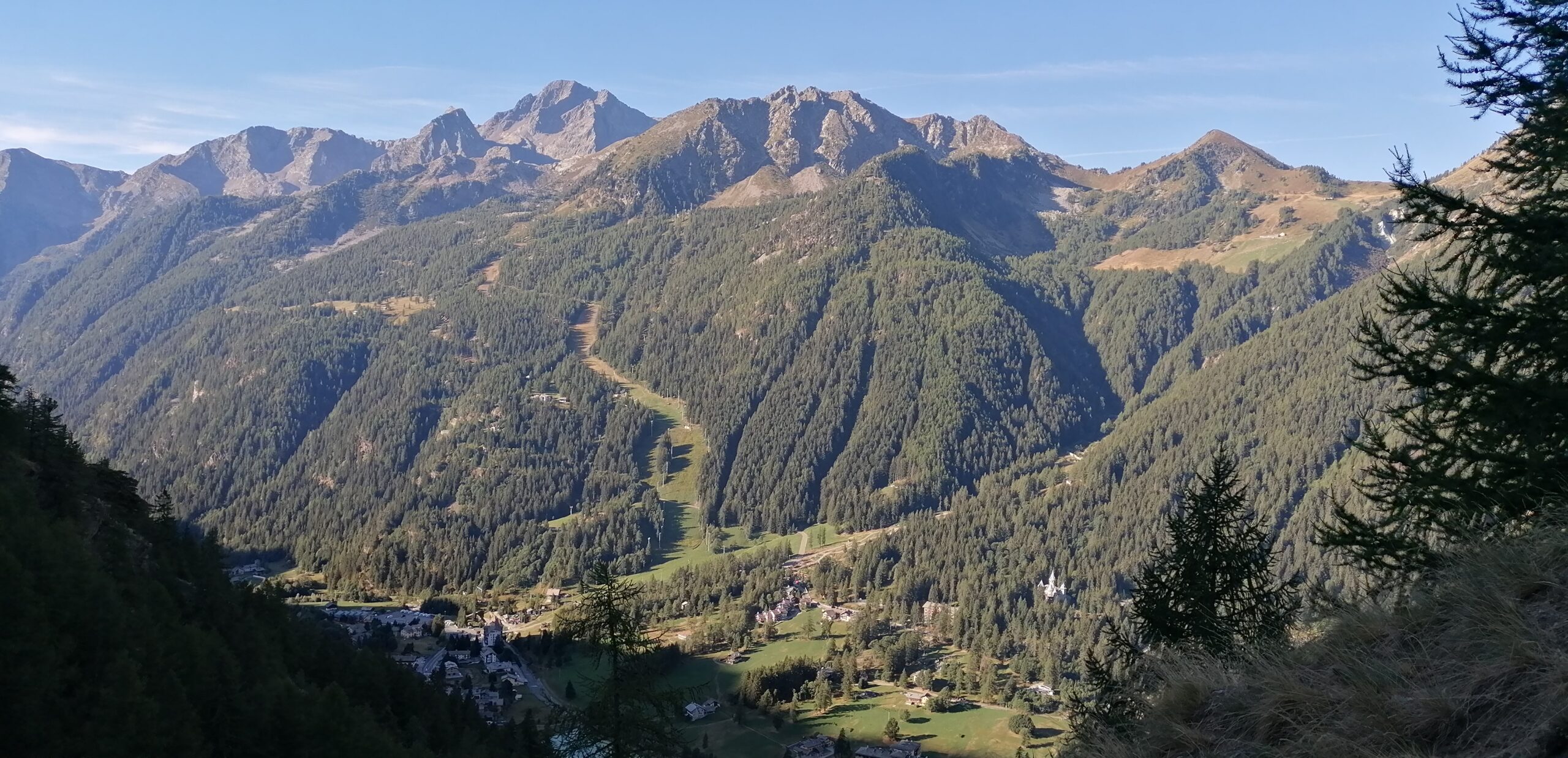All’uscita dalla fascia di bosco il sentiero risale un canalone erboso e si porta sulla spalla di sinistra ove si gode un’ottima visuale di Gressoney-Saint-Jean.