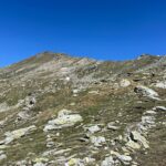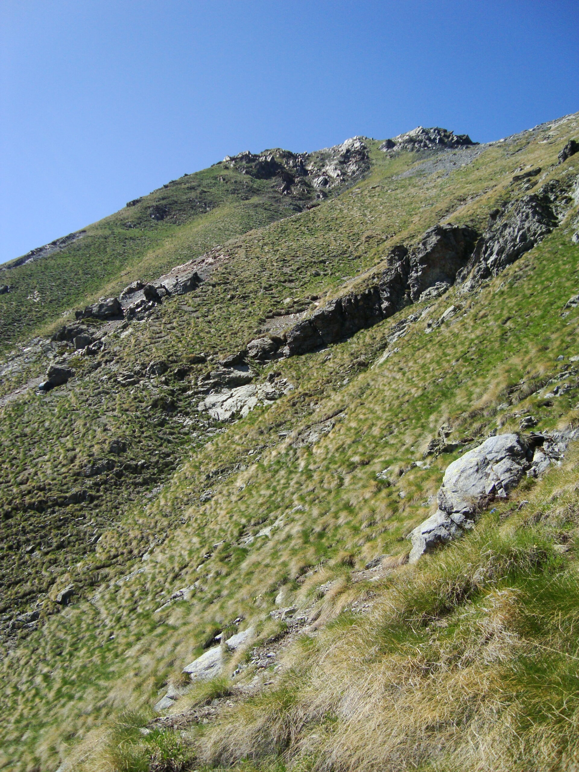 Dal Colle svoltare a sinistra e seguendo la tubazione dell’acqua ci si porta sul pendio sud della vetta, raggiunto un costone (prima del serbatoio acqua) risalirlo su erba e roccette sino a raggiungere la cresta. (il pendio sud è comunque percorribile in tutta la sua estensione, però al centro c’è terreno più friabile difficile da risalire). Una volta in cresta la si segue senza difficoltà sino sotto il muretto finale, dove spostandosi leggermente a sinistra si raggiunge agevolmente la vetta pianeggiante.