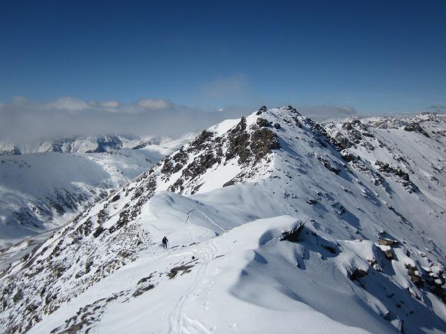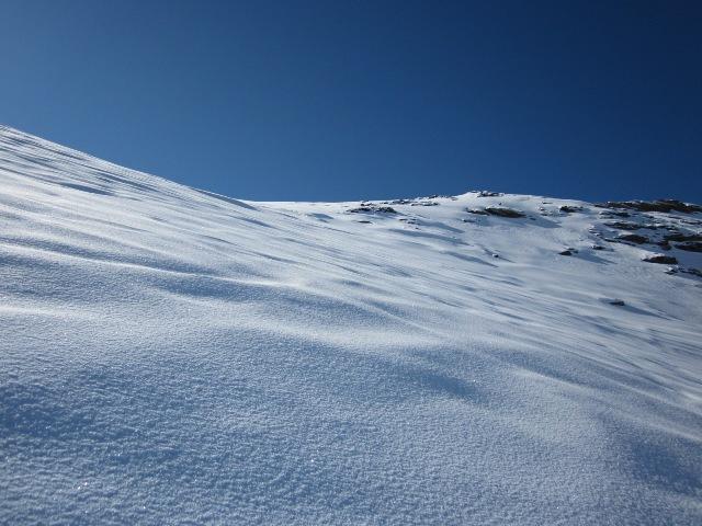 Partenza verso le 8.15 dal ponte, che si raggiunge agevolmente in auto. Nella parte bassa del vallone ci sono diverse grosse slavine cadute di recente, evidentemente è la neve degli ultimi giorni che ha già scaricato. Nessun problema in salita fino al piano, poi il pendio finale era ancora tutto vergine, con 20-30 cm di neve fresca caduti nella notte e che avevano completamente cancellato le tracce del giorno precedente. Incredibilmente, solo una persona davanti a noi ha scelto la Valfredda, gli altri andavano tutti all’Almiane, e quindi il pendio finale era tutto da battere…ha ovviamente iniziato lui visto che era davanti, poi siamo riusciti a raggiungerlo un po’ oltre la metà del canale, così da potergli dare il cambio nella tracciatura. Arrivati al colletto intorno alle 10.45, ho poi tentato di salire in vetta ma mi sono arreso poco sotto uno degli ultimi torrioni in quanto il terreno mi sembrava abbastanza instabile e da solo non mi sono fidato a proseguire…