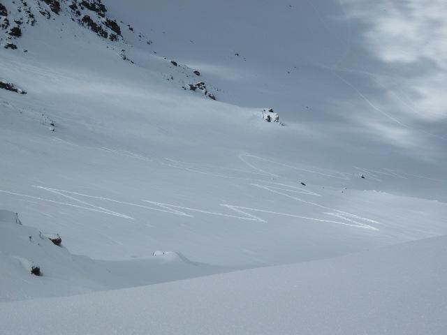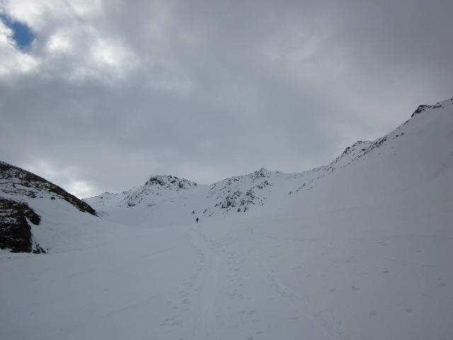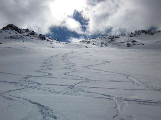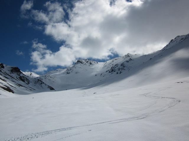 Discesa iniziata intorno alle 11.30, praticamente per primi e quindi con il pendio ancora tutto vergine e a nostra completa disposizione…i primi 100 metri sotto il colletto bisogna fare un po’ di attenzione alle pietre nascoste dalla neve, poi da lì in giù 400 metri di farina incredibilmente bella…uno spettacolo se si pensa che siamo ad Aprile!!! Sul piano un po’ di crosta, ma stando leggeri si riusciva comunque a sciare; in basso ovviamente un po’ pesante, ma stando al centro del vallone non si sfonda e si arriva al ponte senza nessun problema.