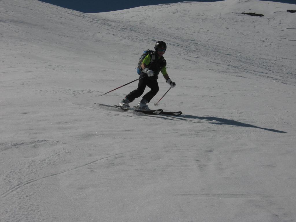 Ivano, Dario e Aldo, dopo aver scartato Roc Ciardonet perché immerso nelle nebbie, ipotetici percorsi ripidi per temperature, si divertono assai su una neve perfetta. Scesi ore 10 e 30 ma teneva ancora. In discesa, arrivati a metà valanga (interminabile), prendiamo sentiero estivo. Soluzione consigliata. PS pare che valanga e tronco d’albero impediscano accesso a Scarfiotti.
