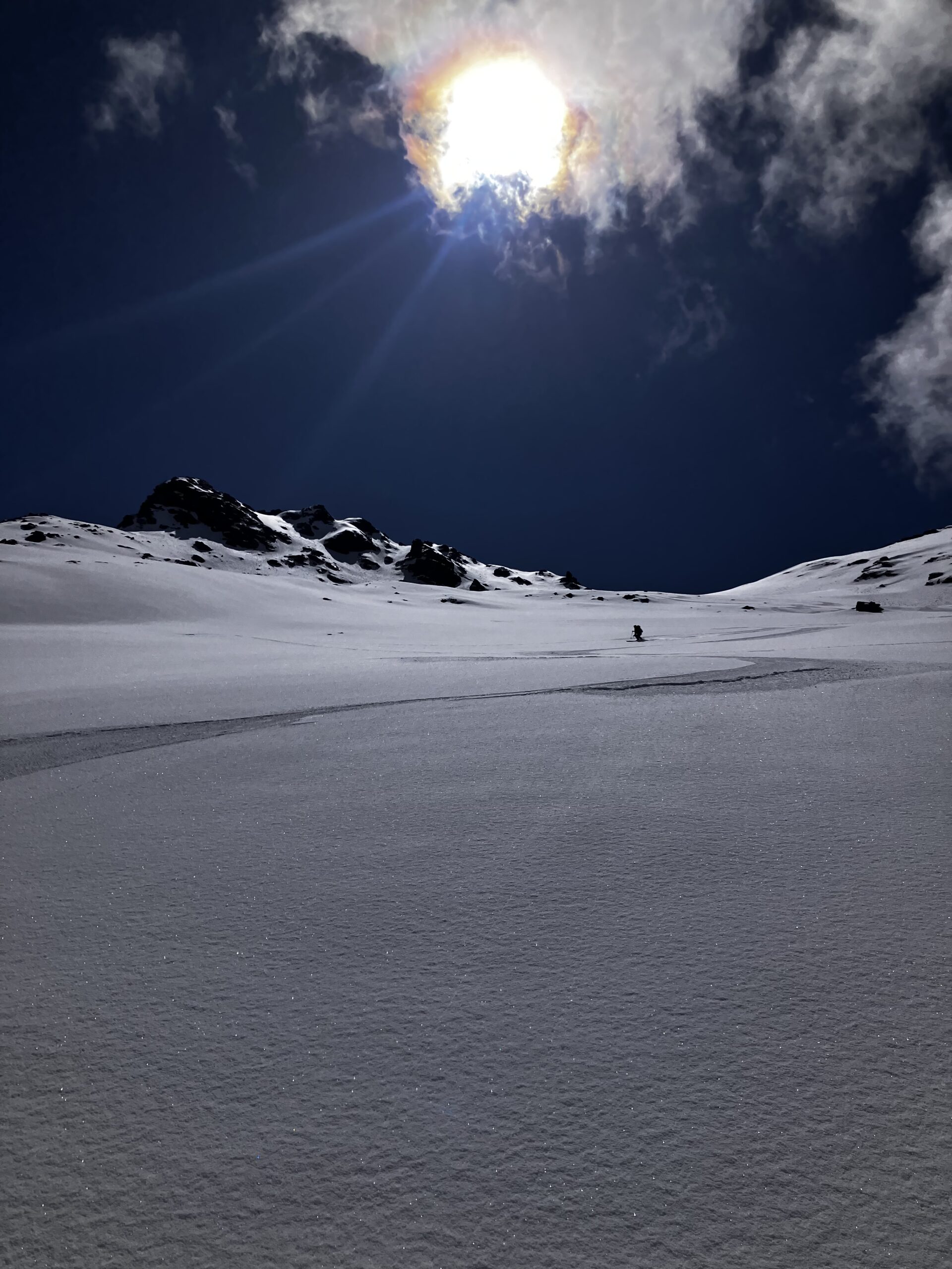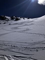 8 stelle !!!!fondo duro e liscio, con 2 cm di farinella appena scesa pendio intonso solo noi e nessun altro… arrivati all’ incrocio del sentiero estivo abbiamo proseguito nella forra sulla valanga.. ultimi 200 metri di sopravvivenza ma si arriva alla strada sci ai piedi