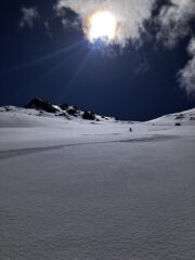 partiti dal ponte alle 7,45 preferdo per velocità’ salire dal sentiero estivo sci a spalle… a quota 2250 il sentiero estivo raggiunge il vallone … da li sci (rampant nel canale)
